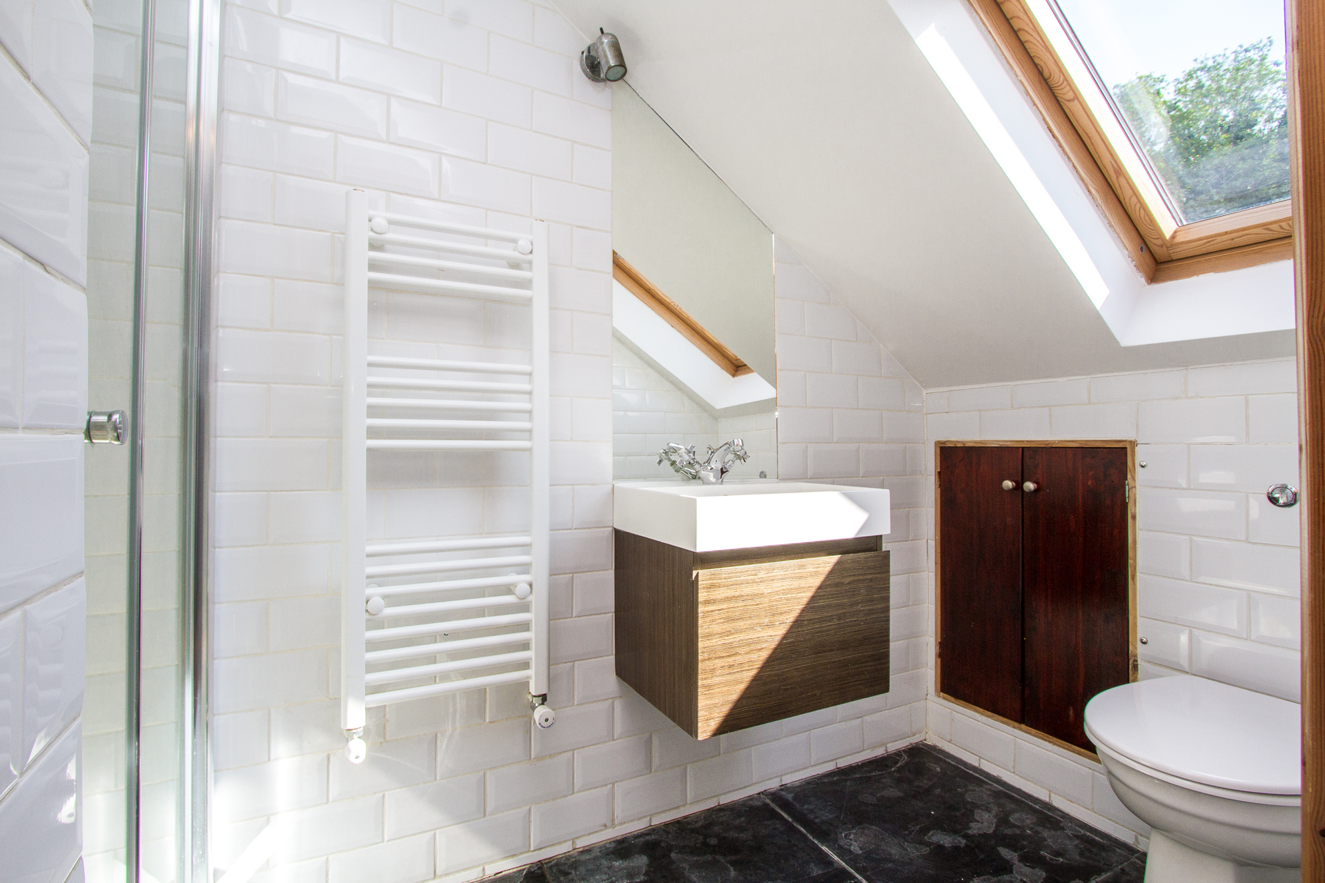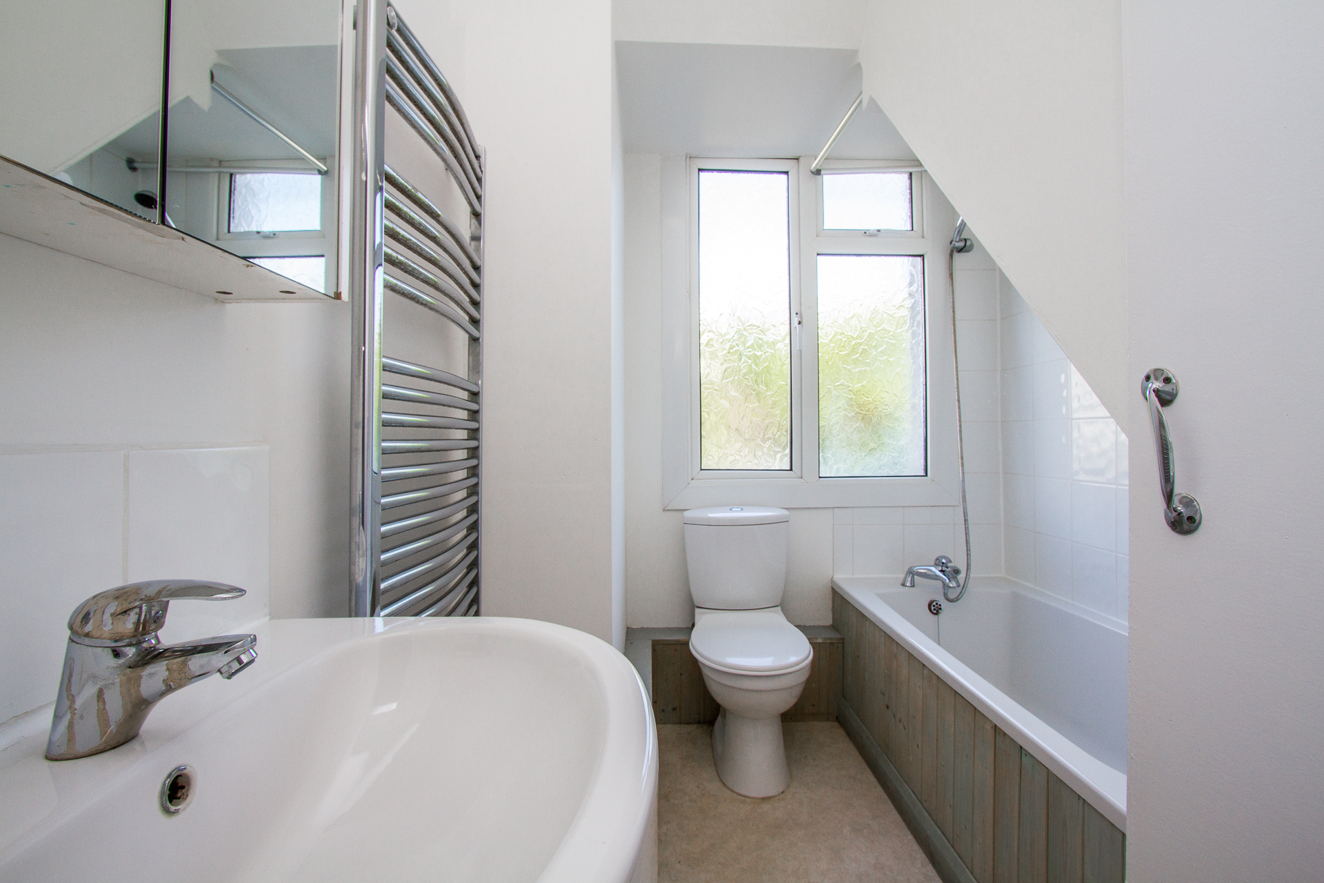 The property is accessed on the raised ground floor via its own private entrance into a smart hallway. Immediately to the left is the first bedroom, it is a lovely bright room with a westerly aspect. Beyond this is the second bedroom a terrifically bright room with a large window benefitting from a lovely green vista. The ground floor accommodation is completed by the large contemporary bathroom with a classic white suite.