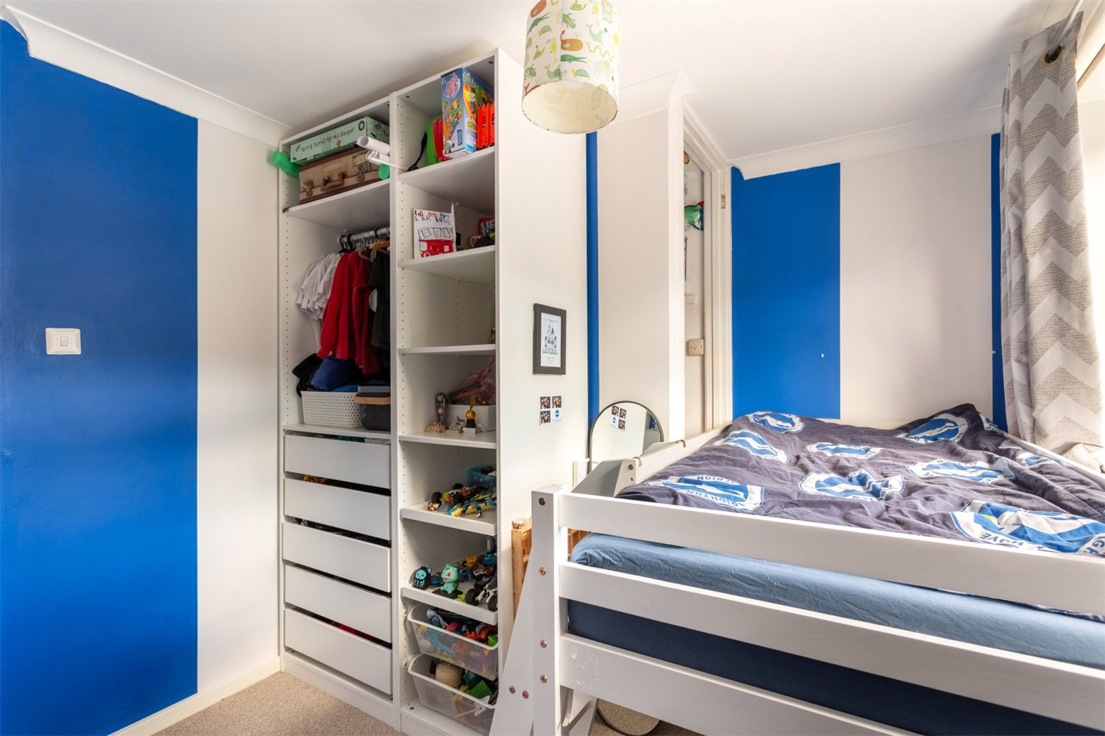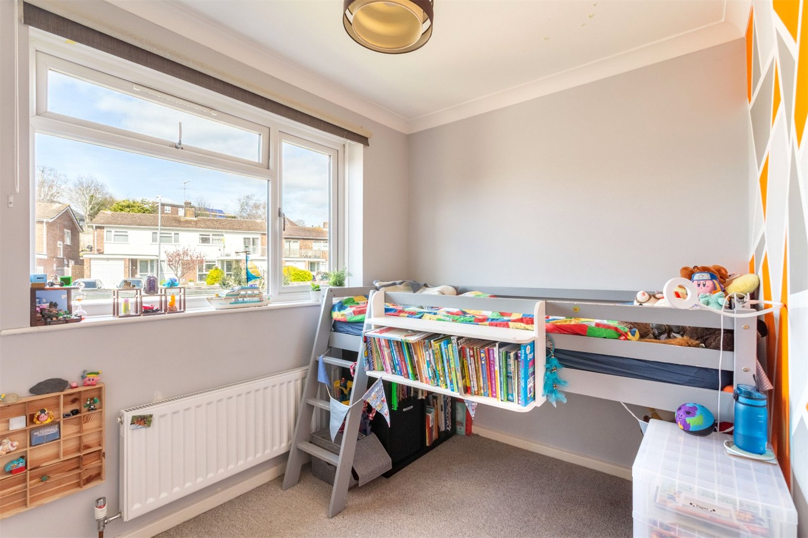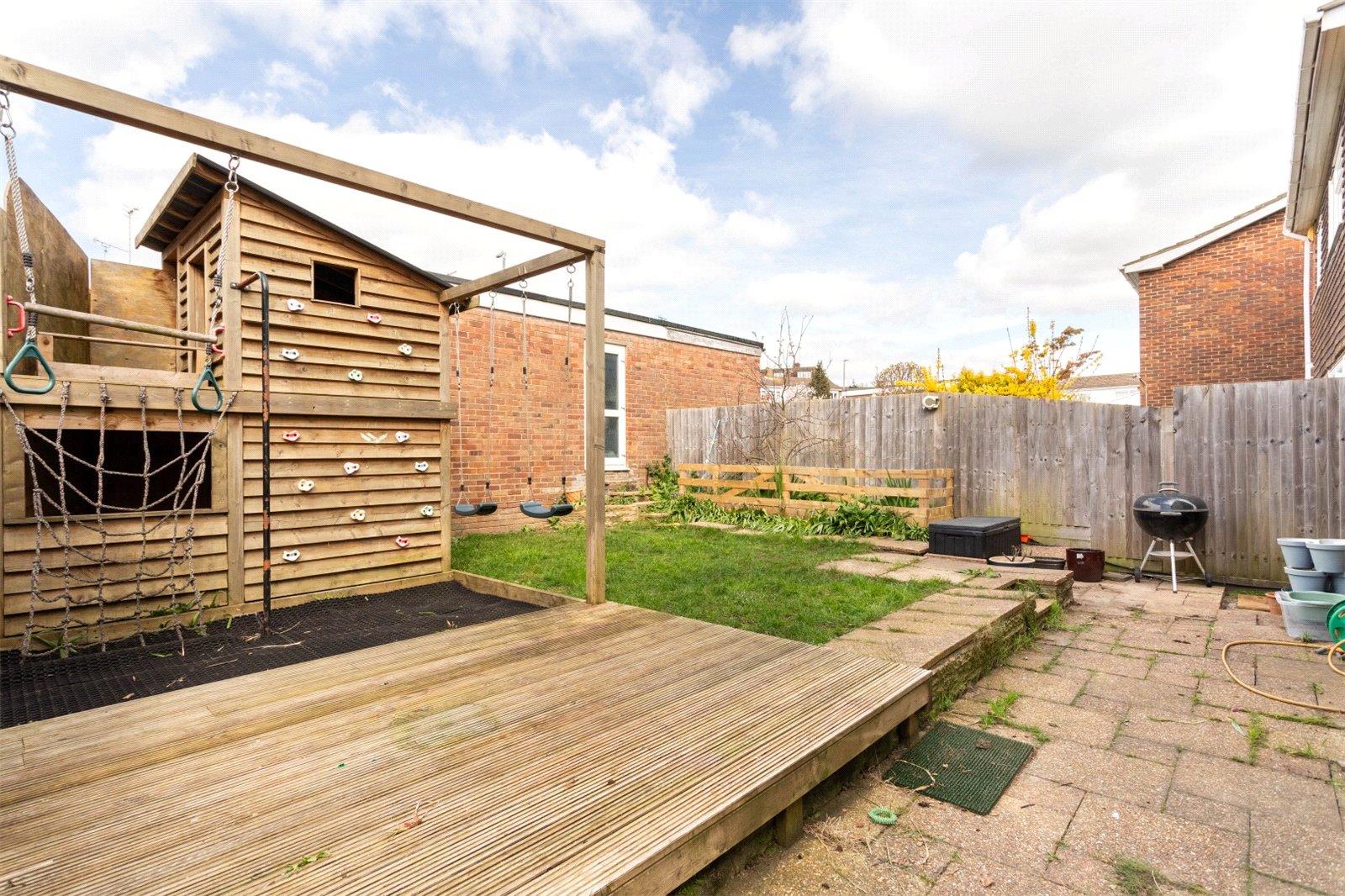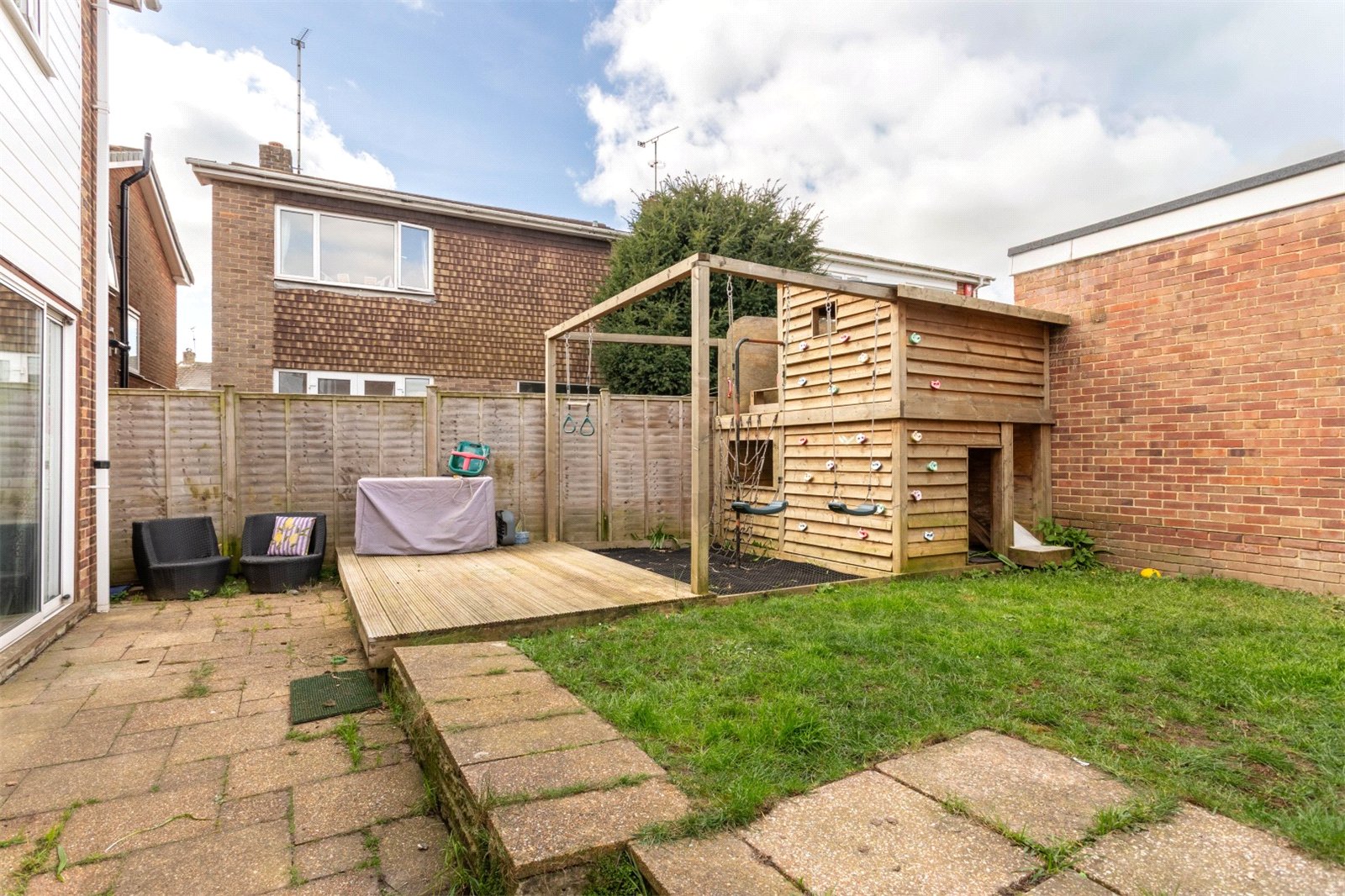 To the rear, you have a great sized garden with both paved and lawned areas and access to the garage. The current owners have turned the garden into a children’s play paradise. This can easily be removed to open up the garden for more sedate pursuits and enjoyment. The garage is perfect for one car and a great space for storing family bikes and beach equipment. Parking is also very easy for your visitors or a second car on the road at the front of the property.