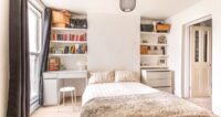 At the other end of the living room, a small flight of stairs leads to the front of the property. Here you will find a bathroom with washbasin, WC and bath with overhead shower as well as a double bedroom where useful shelving built into the alcoves maximises the available space. A further good-sized room can be accessed from here, offering potential to be used as a home office or occasional guest bedroom.