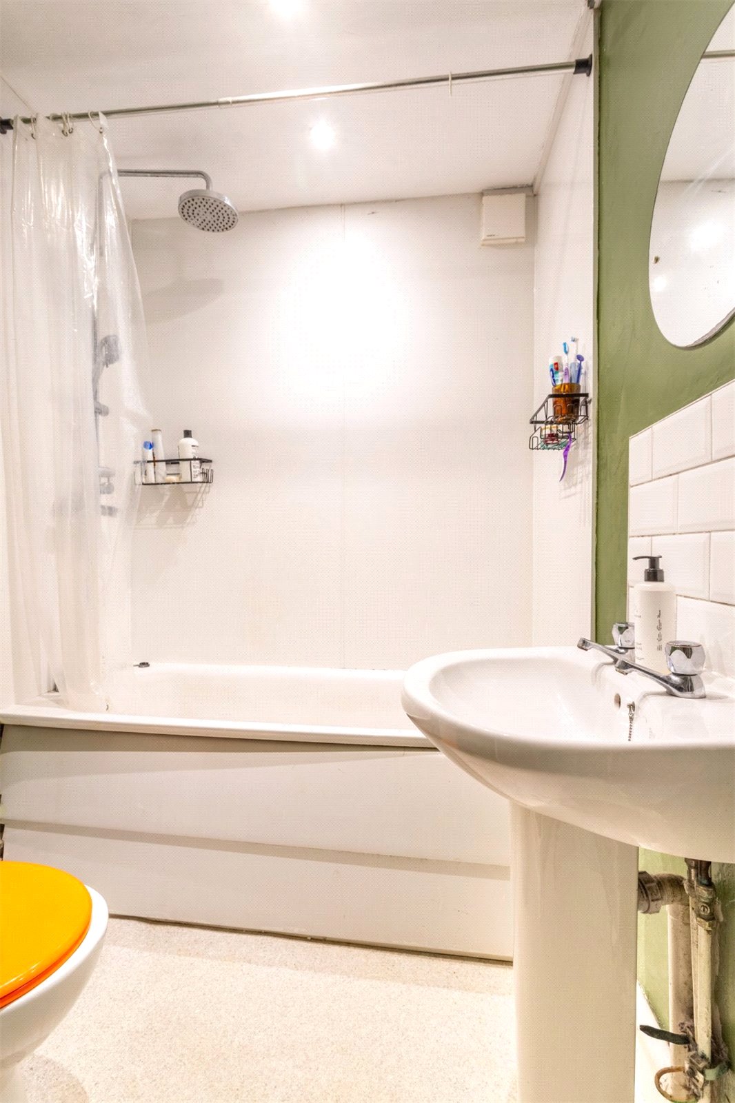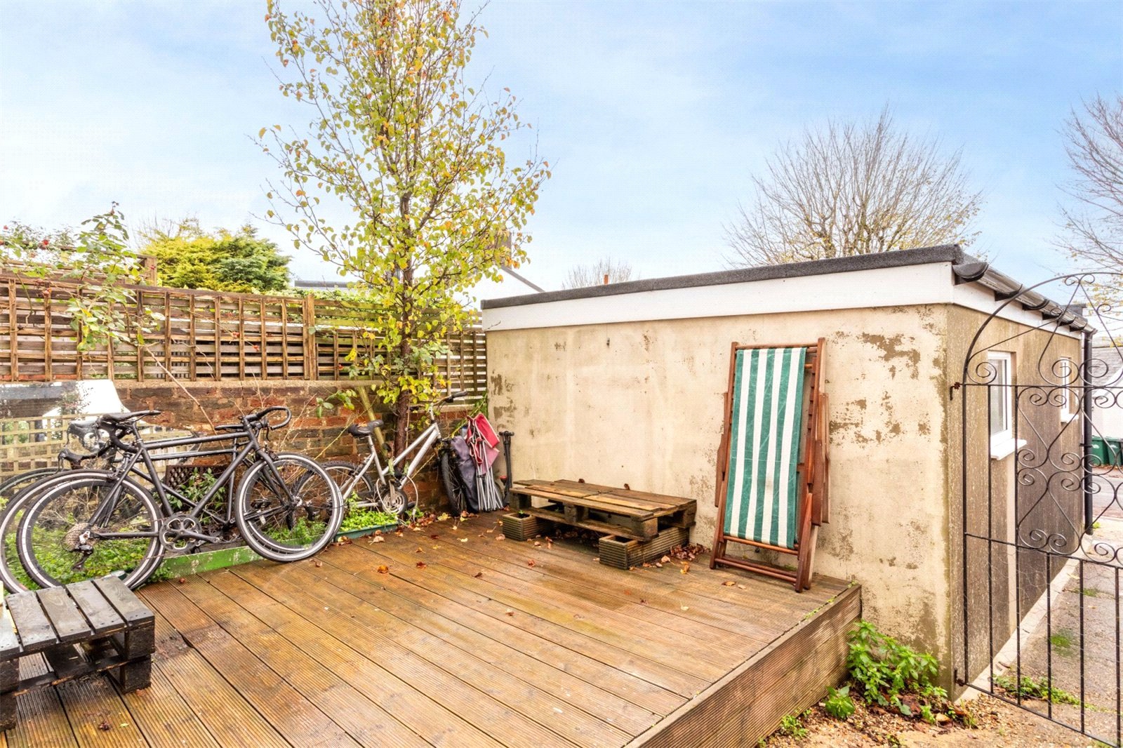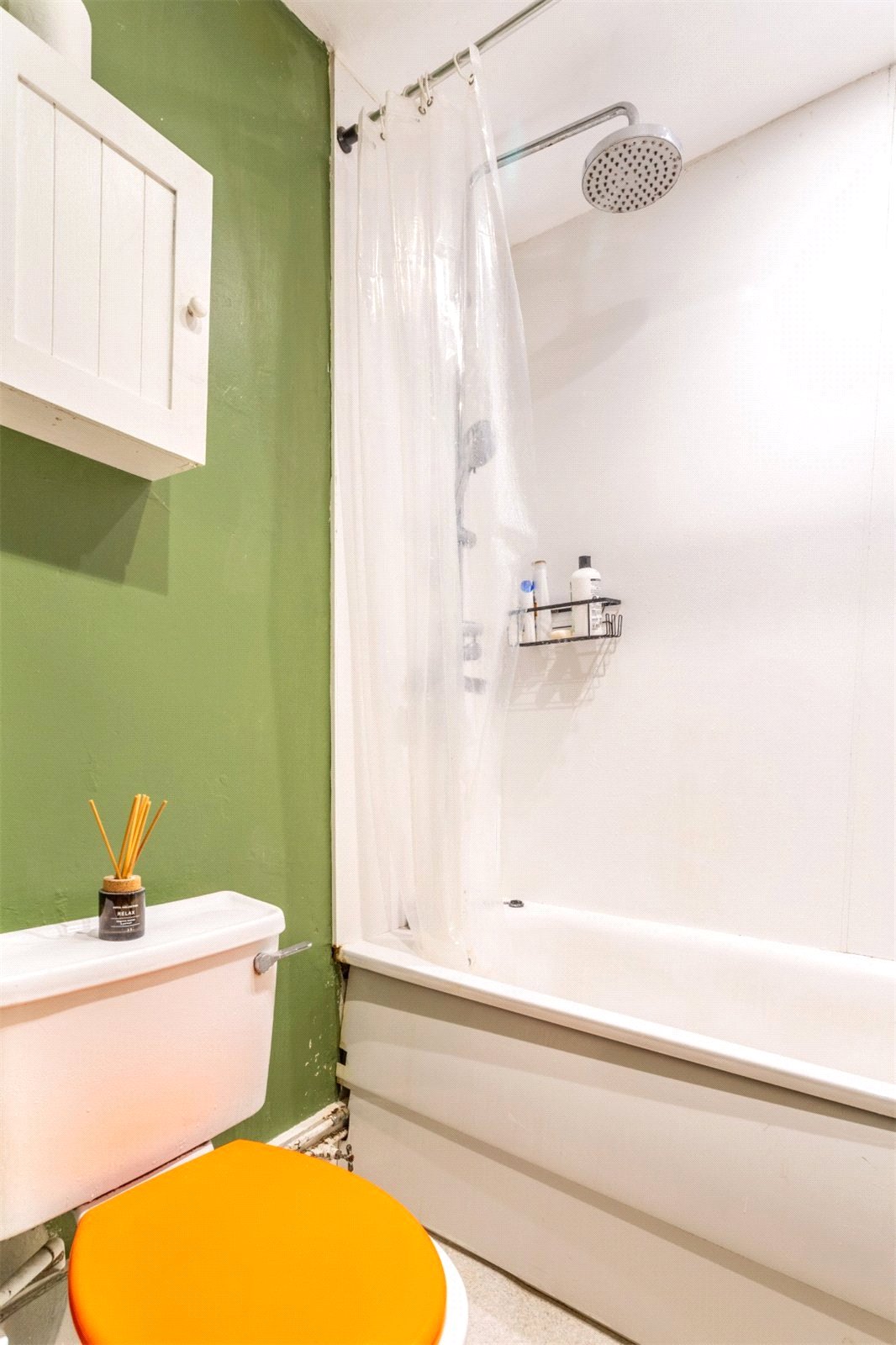 At the other end of the living room, a small flight of stairs leads to the front of the property. Here you will find a bathroom with washbasin, WC and bath with overhead shower as well as a double bedroom where useful shelving built into the alcoves maximises the available space. A further good-sized room can be accessed from here, offering potential to be used as a home office or occasional guest bedroom.
