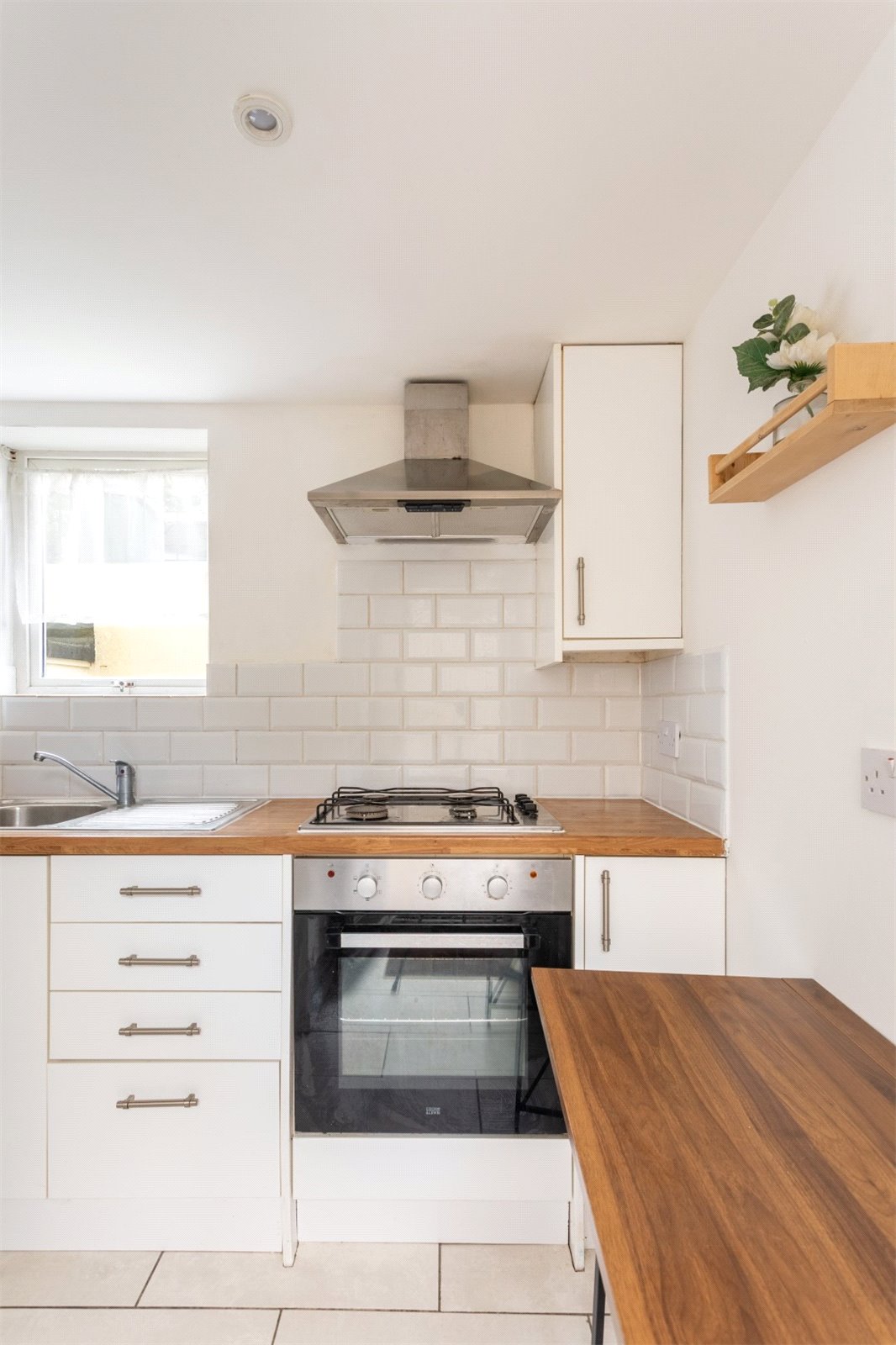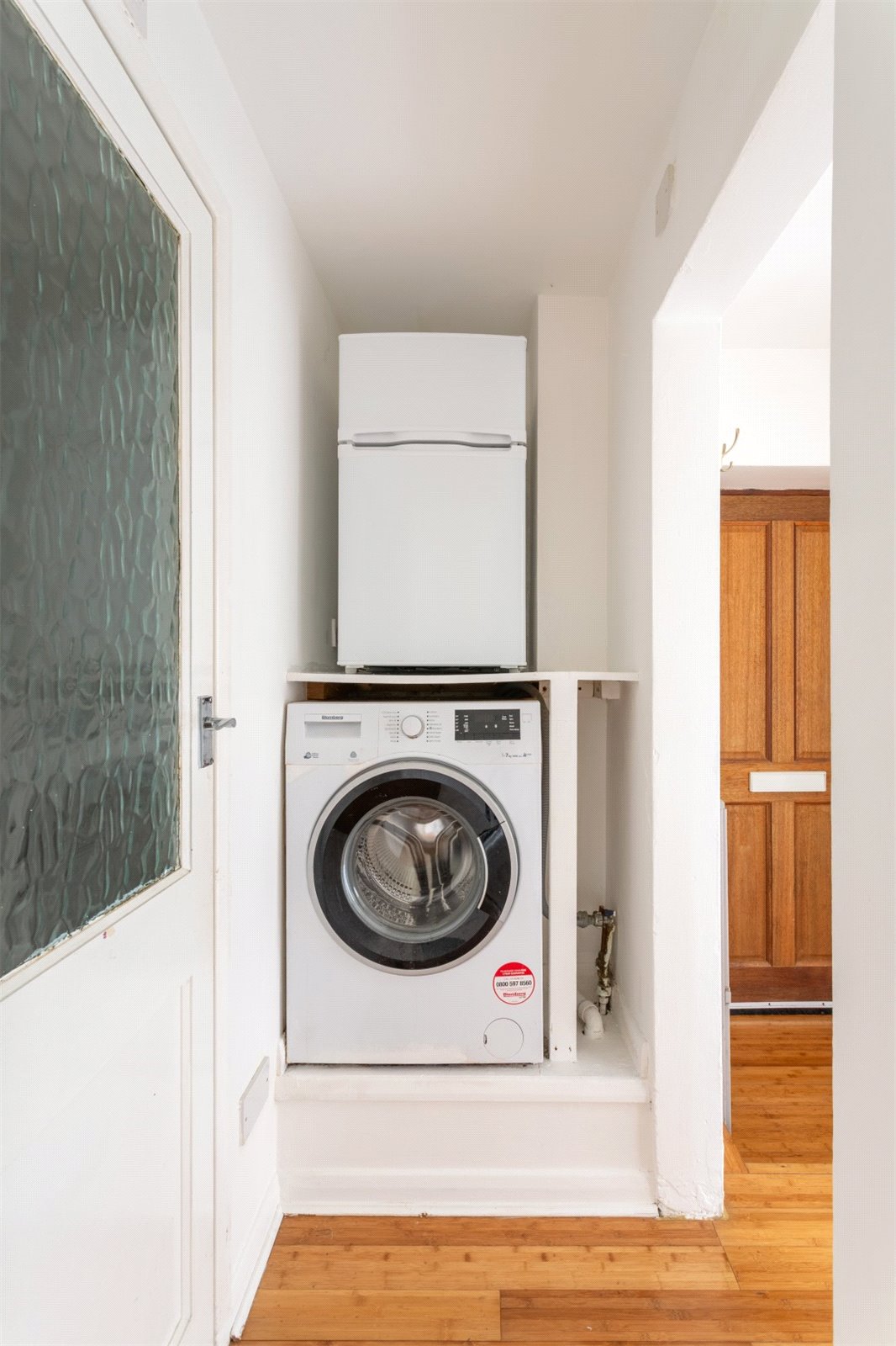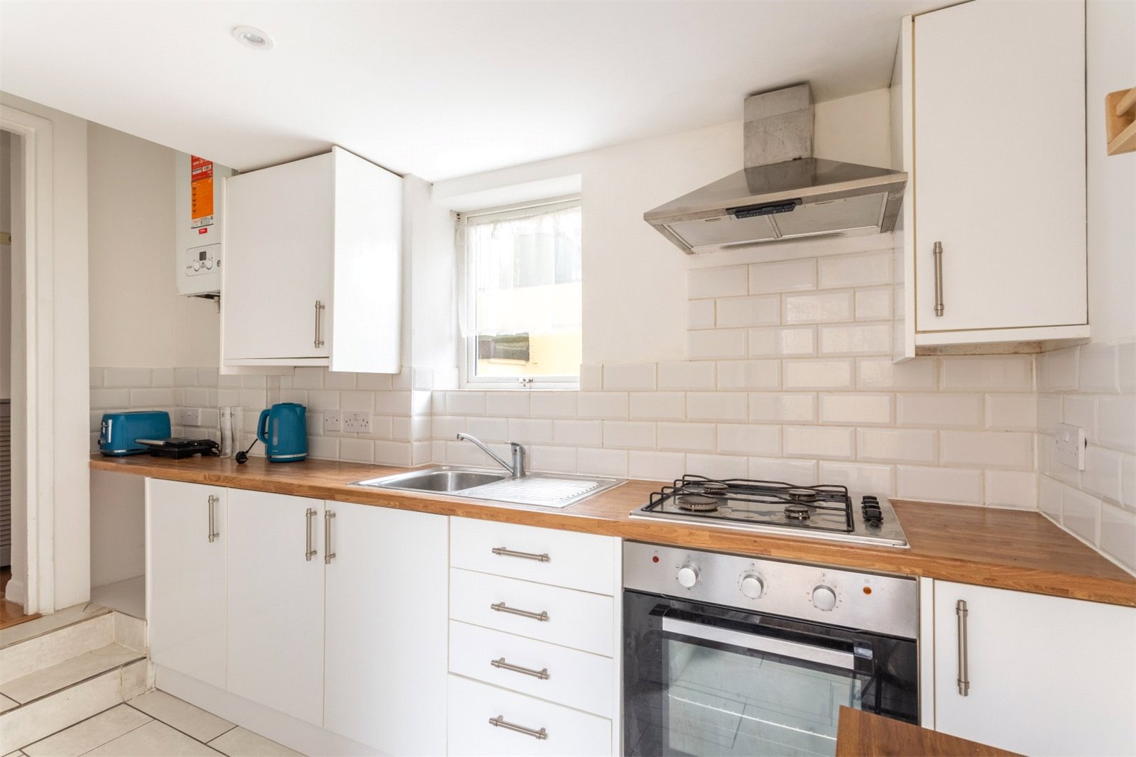 The flat itself is located on the lower ground floor of a converted period building. As you enter the property from its own private entrance, you are greeted by the hallway offering access to all rooms in the accommodation. The living room, which enjoys a Southerly aspect, is a bright and airy space which could easily accommodate a sofa and small dining table. The bedroom is a good-sized double benefitting from some useful built in storage. The sleek and stylish kitchen hosts a range of wall and base units and is equipped with an integrated oven, hob and extractor fan. Further down the hallway, there is a handy utility area which houses a washing machine and fridge. The bathroom comprises a WC, wash basin, mirror and bath with shower attachment. The property also benefits from a small private patio area.