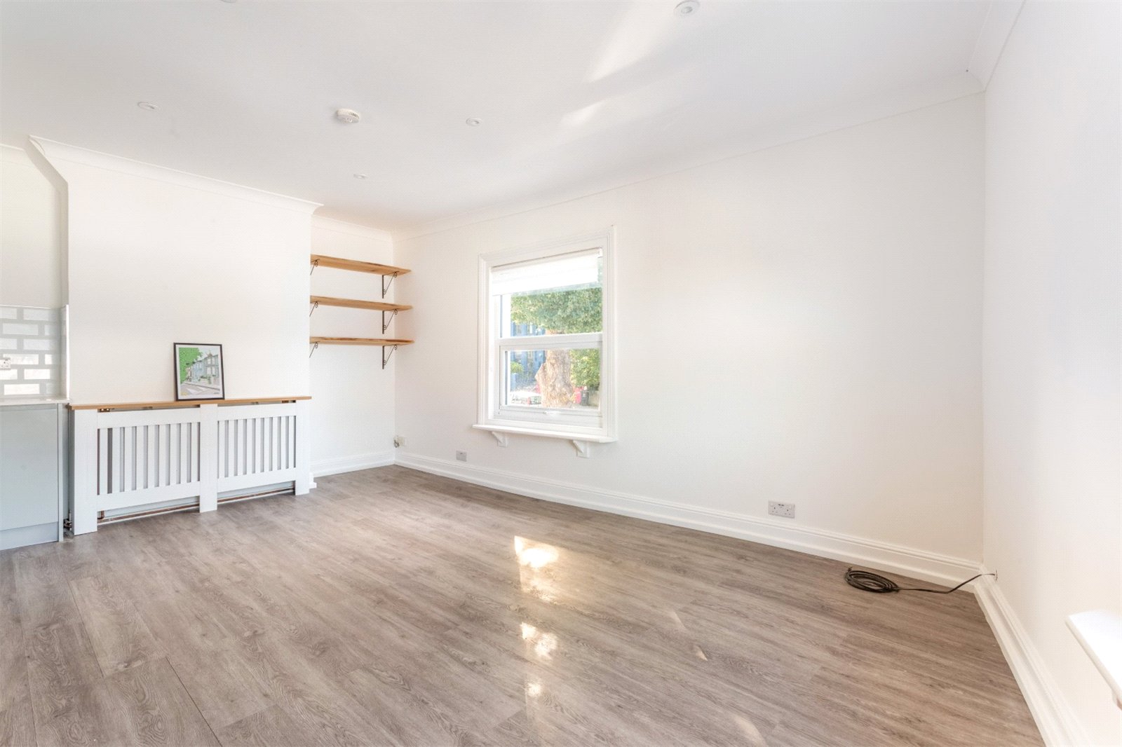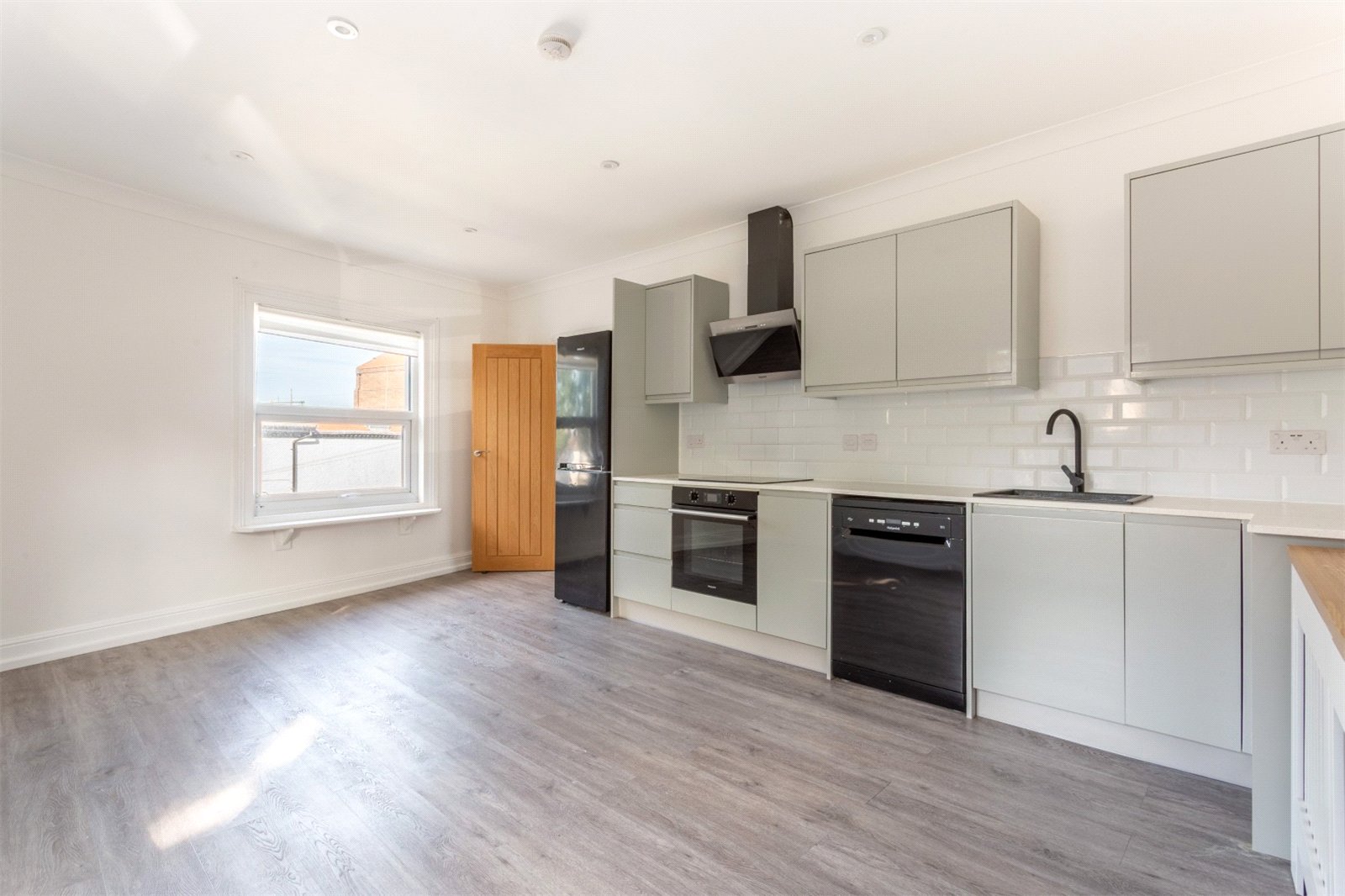 At the front of the property is a substantial dual aspect reception room which accommodates the living room and modern kitchen complete with appliances. Spanning over five meters in width, this room offers plenty of space to comfortably accommodate both a sofa and dining table.