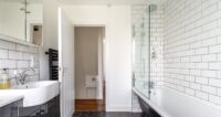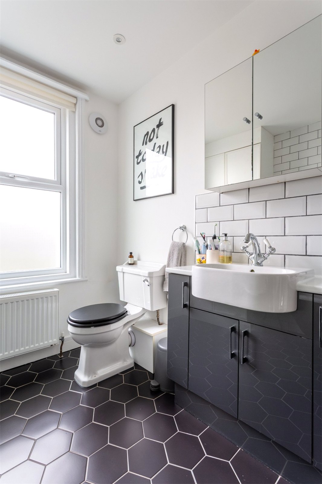 Upstairs on the first floor, there are two generously proportioned double bedrooms. The larger is located at the front of the house and benefits from a bay window, whilst the second bedroom enjoys views of the garden. Both bedrooms are enhanced by beautiful wooden floorboards, which add warmth and character to each space. Completing the first floor is a family bathroom featuring a roll top bath with rainfall effect shower above, wash basin and WC. A combination of metro and hexagonal tiles adds a contemporary feel to the space.