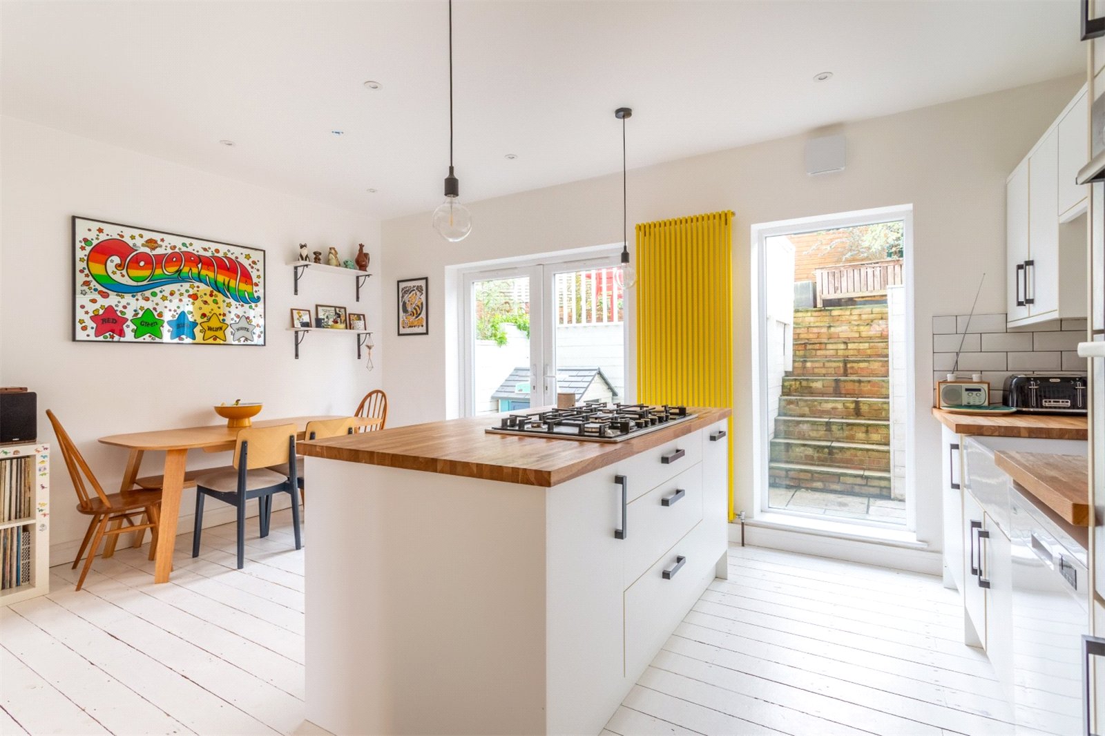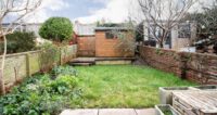 The house boasts an attractive façade and is set back from the main road behind a small front garden planted with mature shrubs. Steps lead up to the front door, which opens into a welcoming hallway, leading to an open-plan kitchen living space. At the front of the property is the living space, accentuated by a high ceiling and a large bay window, allowing plenty of natural light to flood the room. At the rear of the property sits a thoughtfully designed kitchen-diner, fitted with sleek and stylish wall and base units, classic metro tiles and a timeless butler sink. The central island, complete with an with integrated five-ring gas hob ensures both practicality and a welcoming spot for hosting, allowing you to cook and socialise with ease. French patio doors open onto a southeast-facing garden which is arranged over three levels. Immediately outside the house is a patio area, followed by an additional patio in the centre which has space for a dining set and then a good-sized lawn at the top. The garden shed is equipped with an electricity supply, offering the potential for the space to be utilised as a home office.