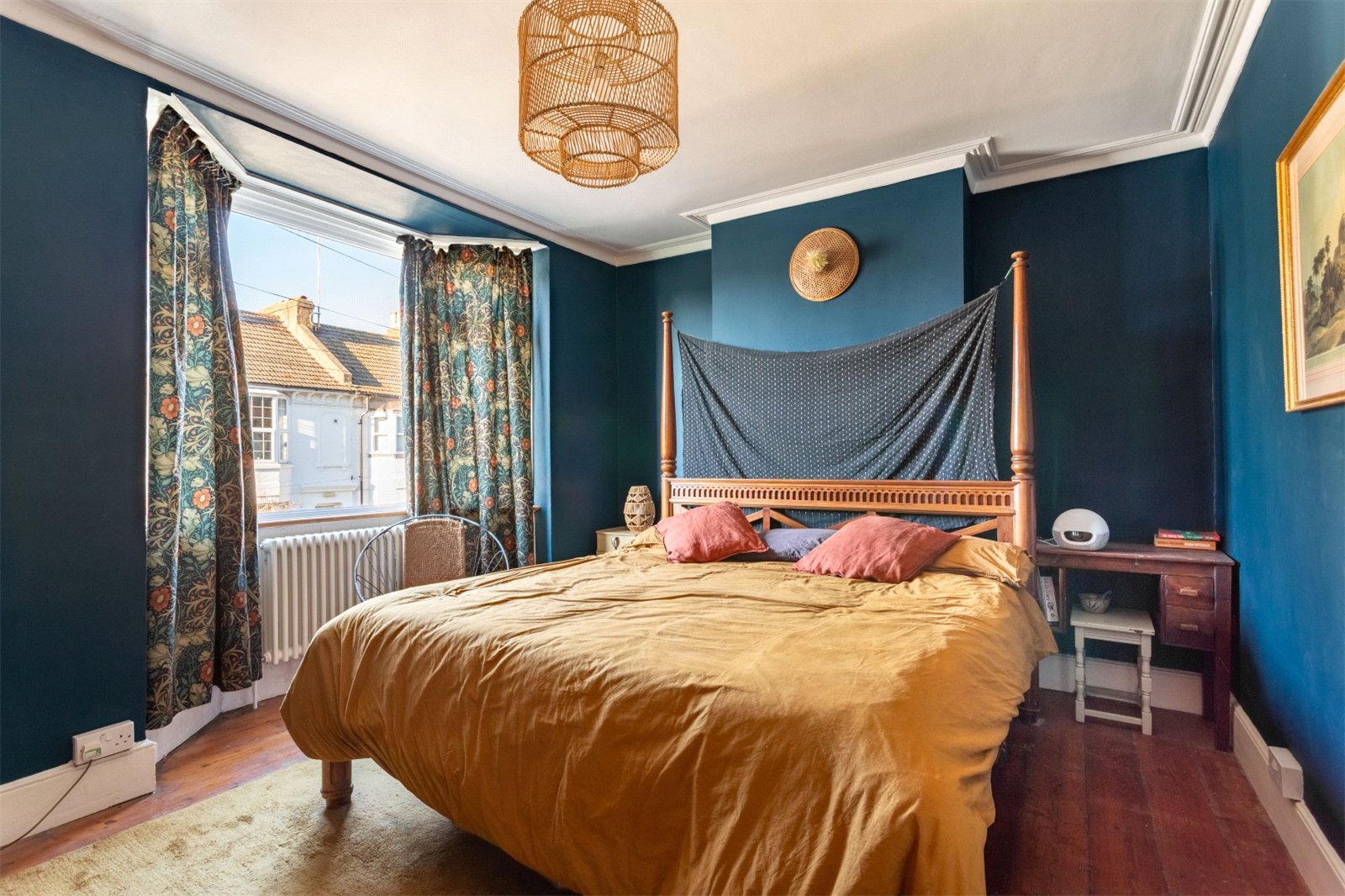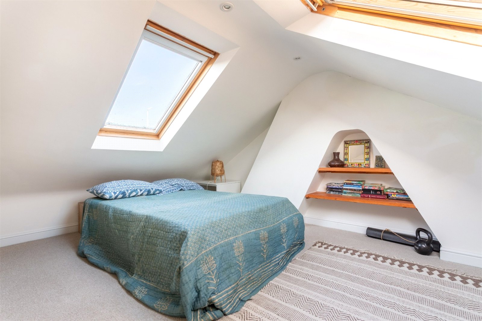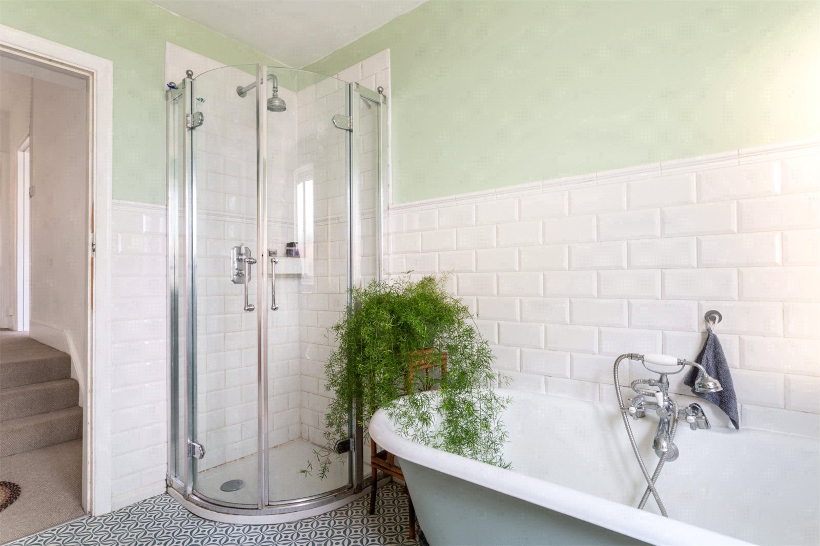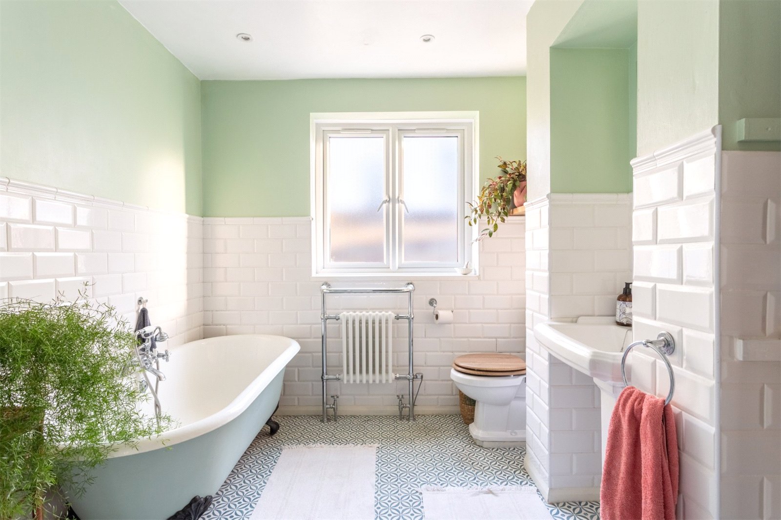 As you go upstairs towards the first floor, you will find the family bathroom located on the half landing. The stylish bathroom suite has been beautifully finished and adds a touch of luxury with its classic roll-top bath. A standalone shower cubicle matches the basin and WC, while the use of metro-style tiles completes the classic look. To the front of the property is the principal bedroom which is a sizeable double spanning the width of the property and enjoys the benefit of a bay window. Deep teal hues beautifully compliment the natural floorboards, creating a warm and comforting feel. There is a further double next to this, while the accommodation is completed by the top bedroom in the bright and airy loft conversion.
