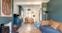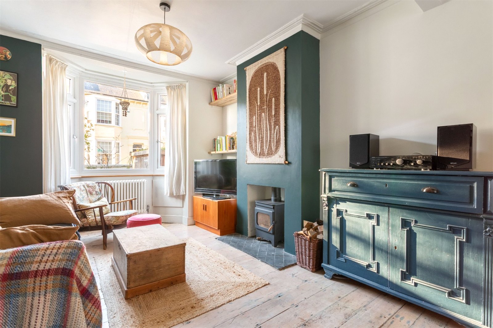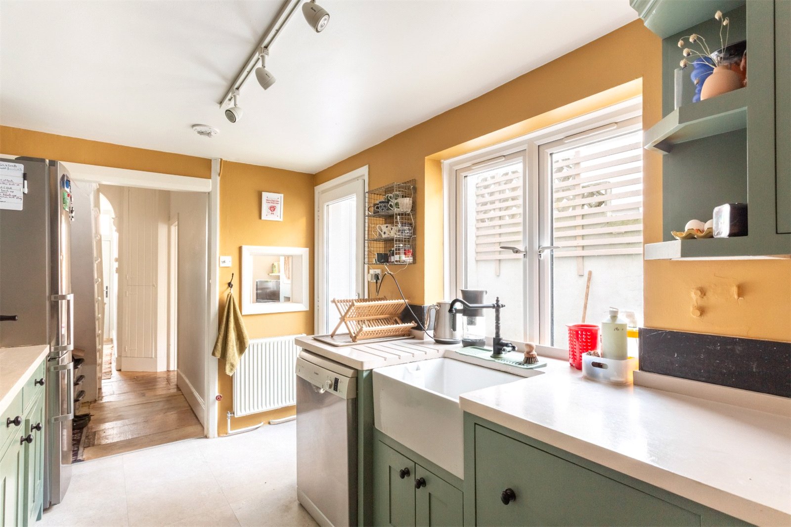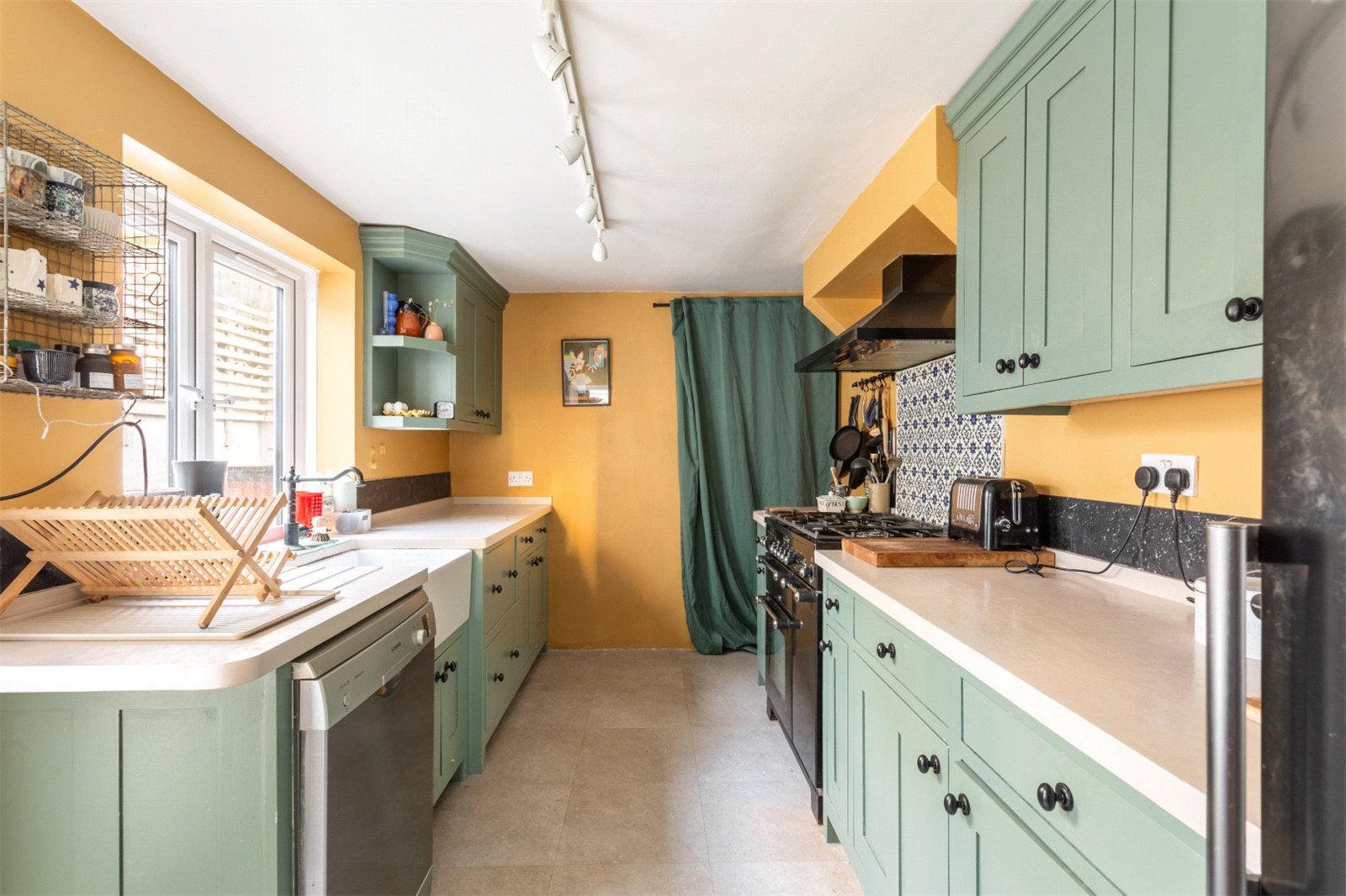 The property itself is located about halfway along the street and is approached via an attractive front garden where the current owners have fitted bike storage. The entrance hall is smart and welcoming and finished in neutral tones. The lounge/dining room is bright and spacious with large windows at each end ensuring plenty of light. The stripped wooden floors add plenty of character and perfectly complement the fireplace creating a warm and cosy heart to the home. To the rear of the property is the kitchen, attractively styled with solid wooden wall and base units in soothing sage tones. Natural worksurfaces and a butler-style sink further enhance the charm of this stylish space, complemented by a Mediterranean-style splashback and rich ochre accents. The back door opens out to a rear patio garden which provides space for a sun lounger or small dining set. Clever use of decking maximises the space available.