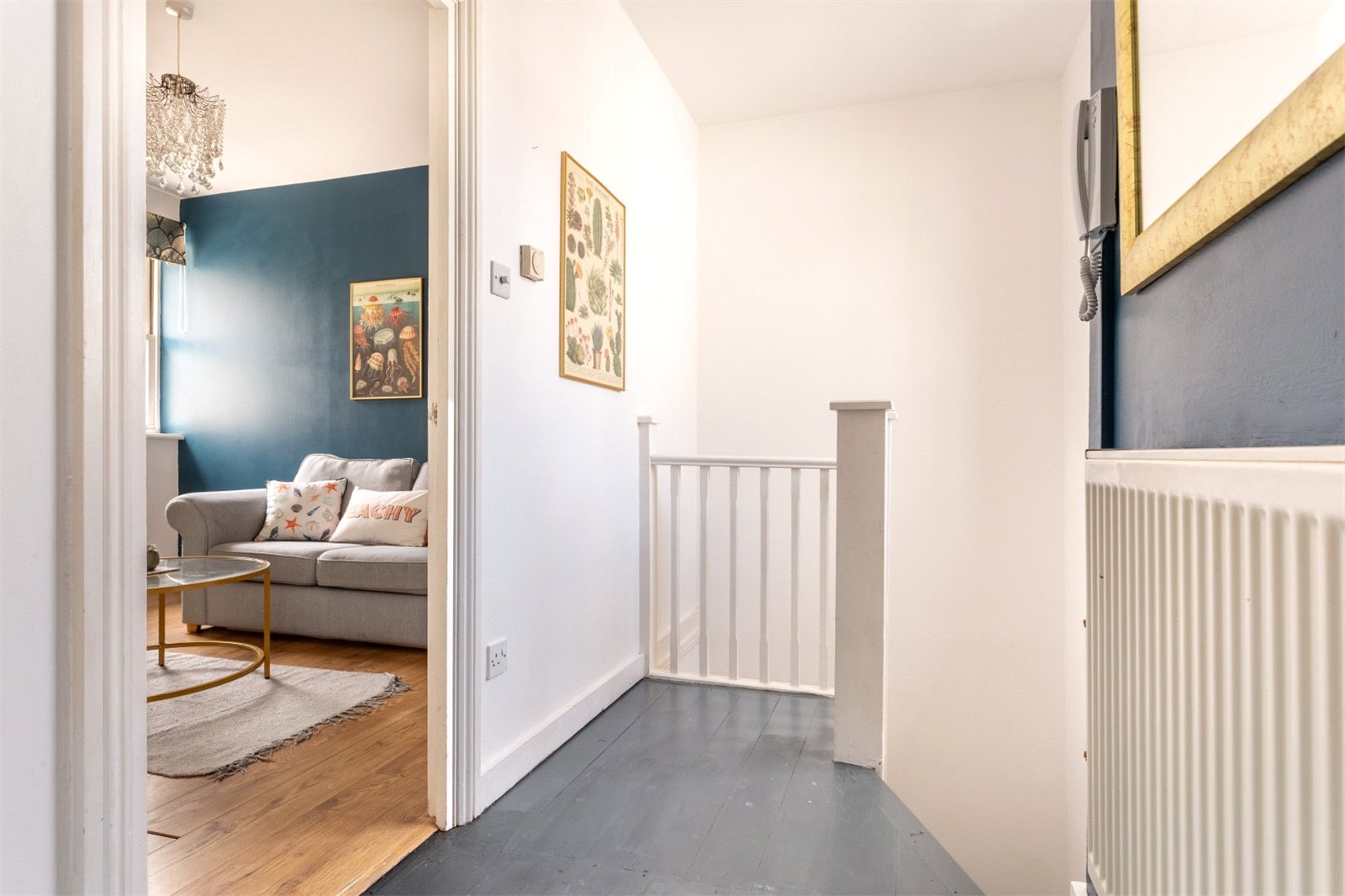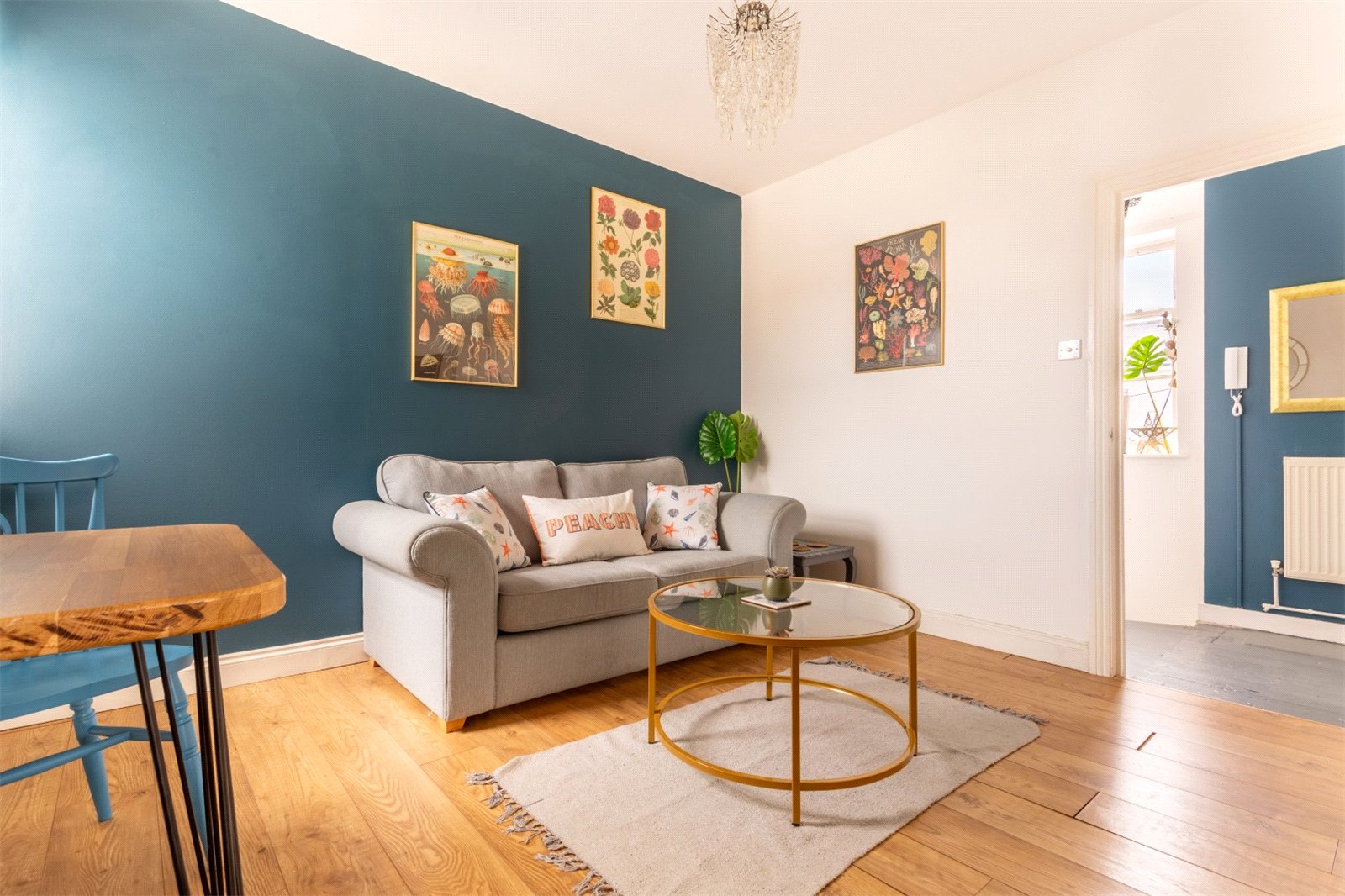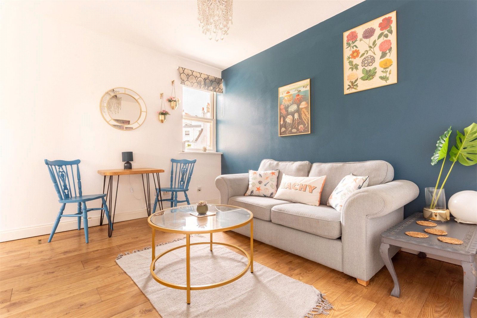 The flat itself is a beautifully finished one bedroom apartment offering contemporary living across the first floor. Stairs rise from the entrance leading to the hallway where a large window fills the space with light. To the front is the main living room, smartly finished with a dark teal feature wall and wood-style flooring. The social living space opens to the kitchen which has been stylishly finished.