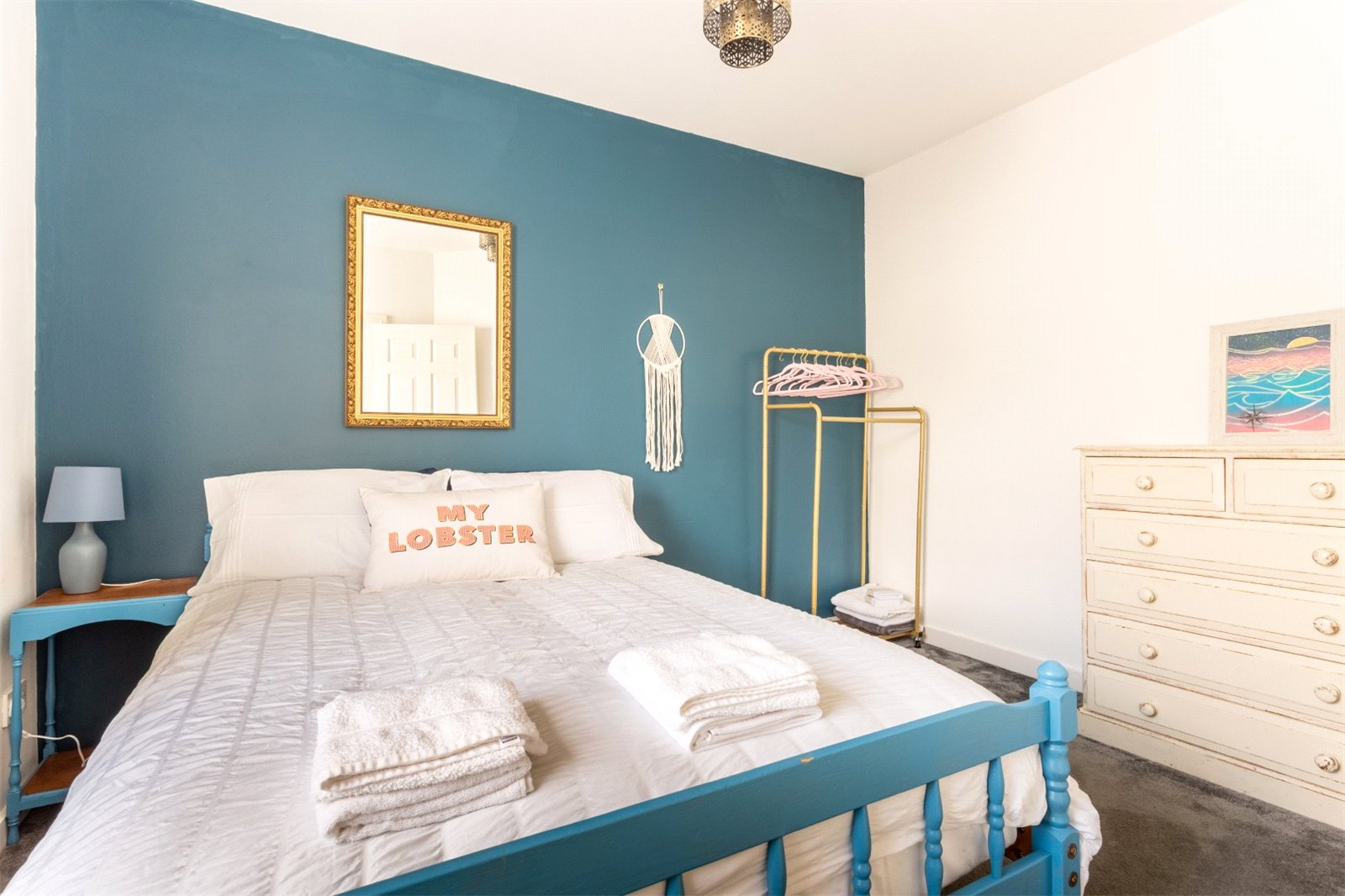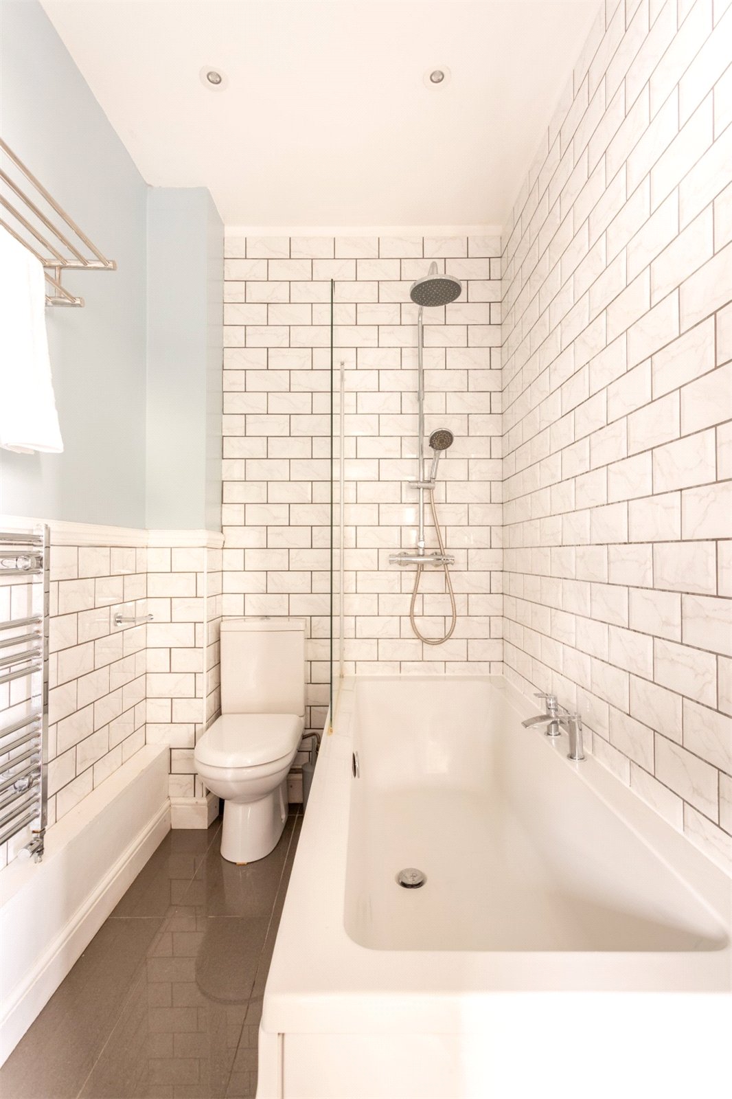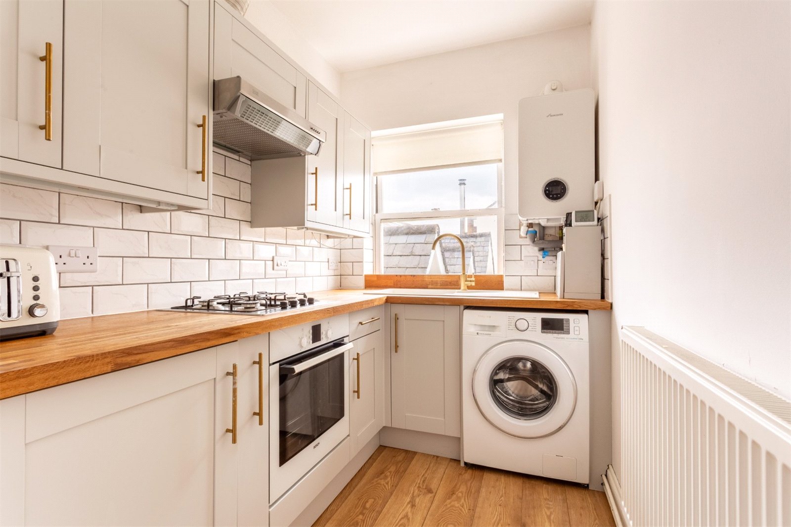 Shaker style units match wooden worktops to offer a classic look, while the bras handles and metro tiles ensure a contemporary finish. Back off the hallway is the bedroom, a well-sized double which once again offers classical styling in abundance. The accommodation is completed by the bathroom where a white suite of panel bath with rainfall shower over, wash basin and w/c is matched with metro-style wall tiles and an engineered floor.