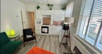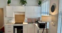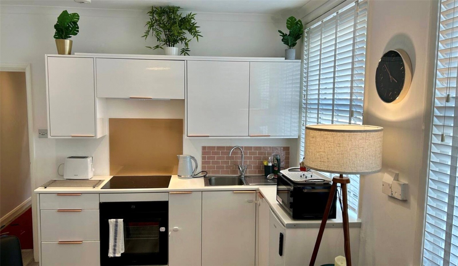 The living space is bright and airy with the brand new kitchen installed to one end, with high gloss cabinets, sleek splashback and rose gold detailing. There is an integrated oven too.