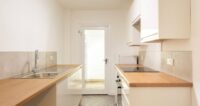 The kitchen boasts sleek and stylish wall and base units and is equipped with an integrated Lamona oven and hob, fridge-freezer, washing machine and dishwasher. A door opens out onto a courtyard garden.