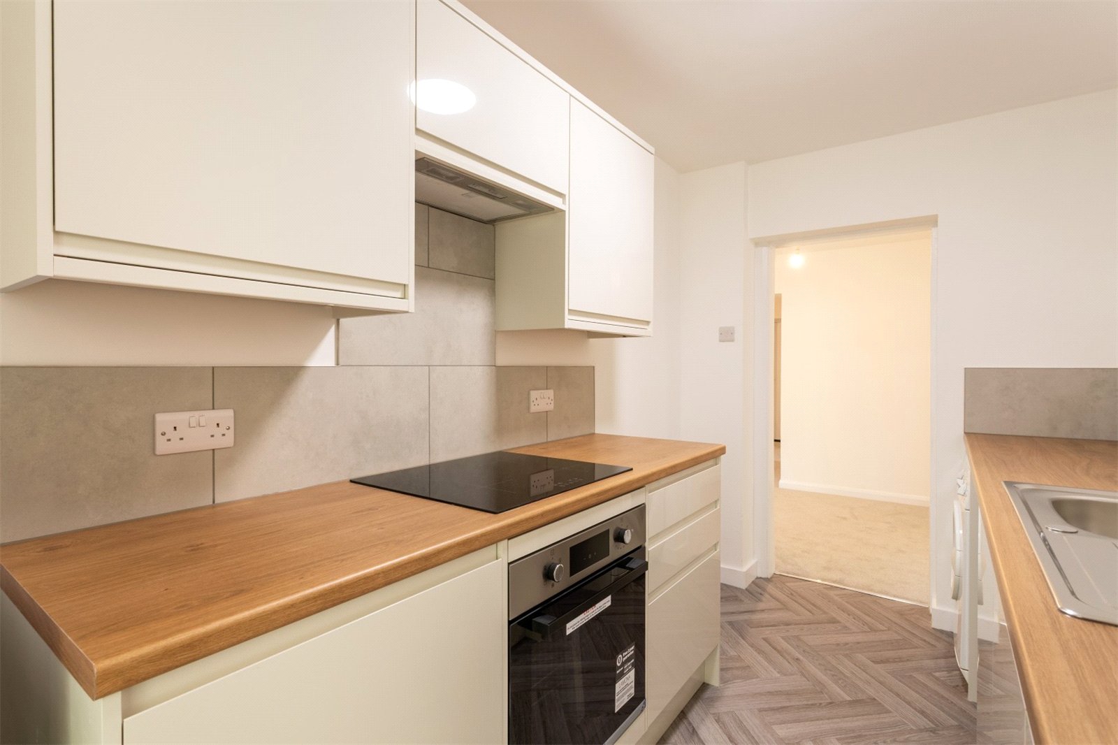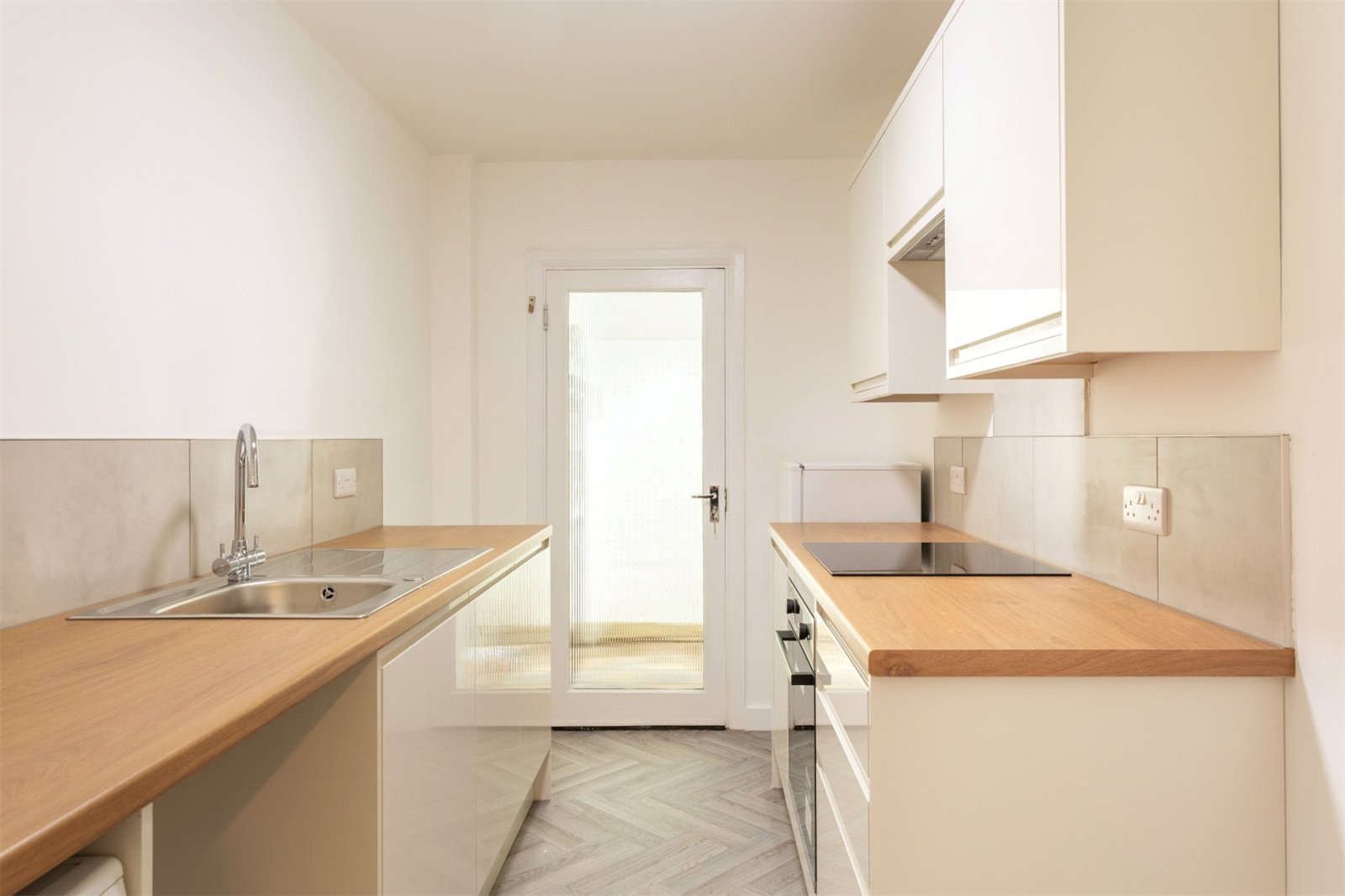 The kitchen boasts sleek and stylish wall and base units and is equipped with an integrated Lamona oven and hob, fridge-freezer, washing machine and dishwasher. A door opens out onto a courtyard garden.