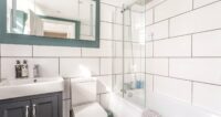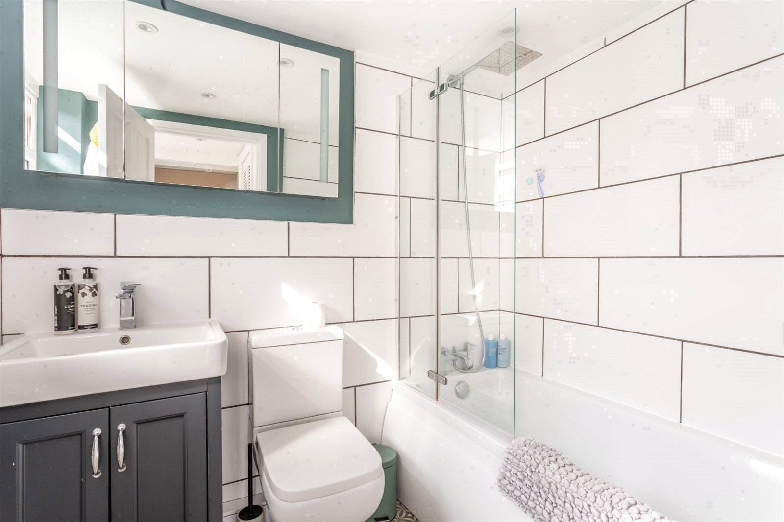 Passing even more storage, you’ll find the recently refurbished bathroom. Again, a very contemporary style and beautifully finished with large white tiling off set with grey grouting. There is a white suite with shower over bath and heated towel rail.