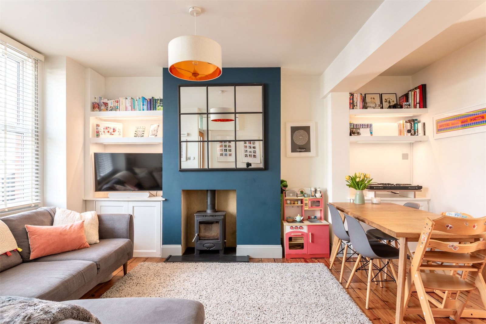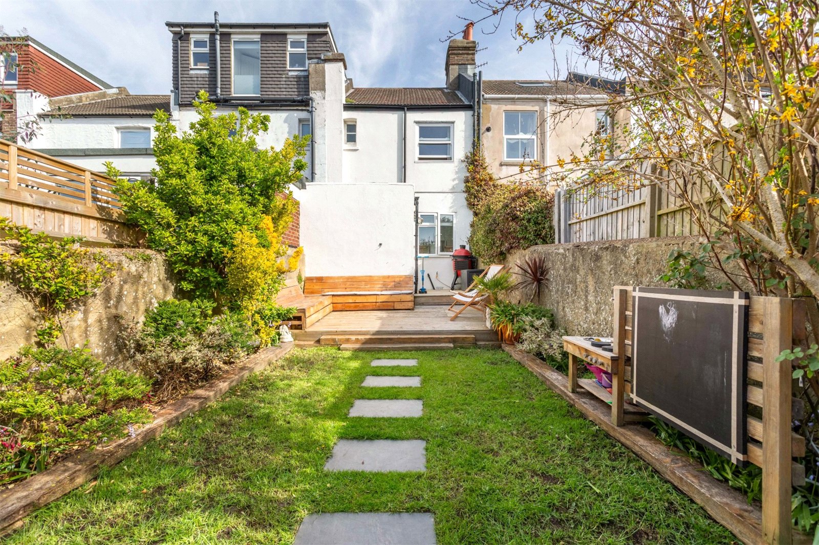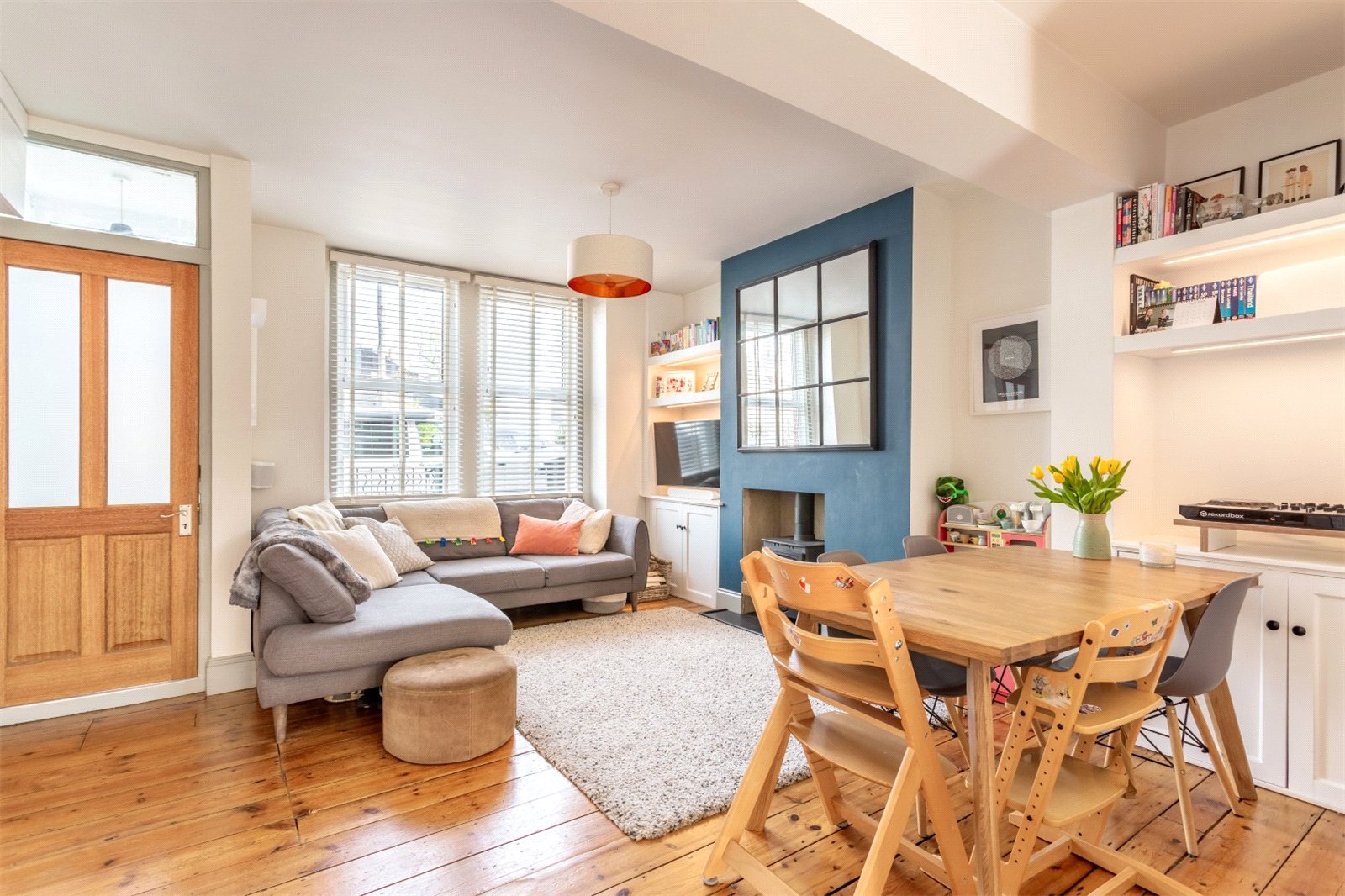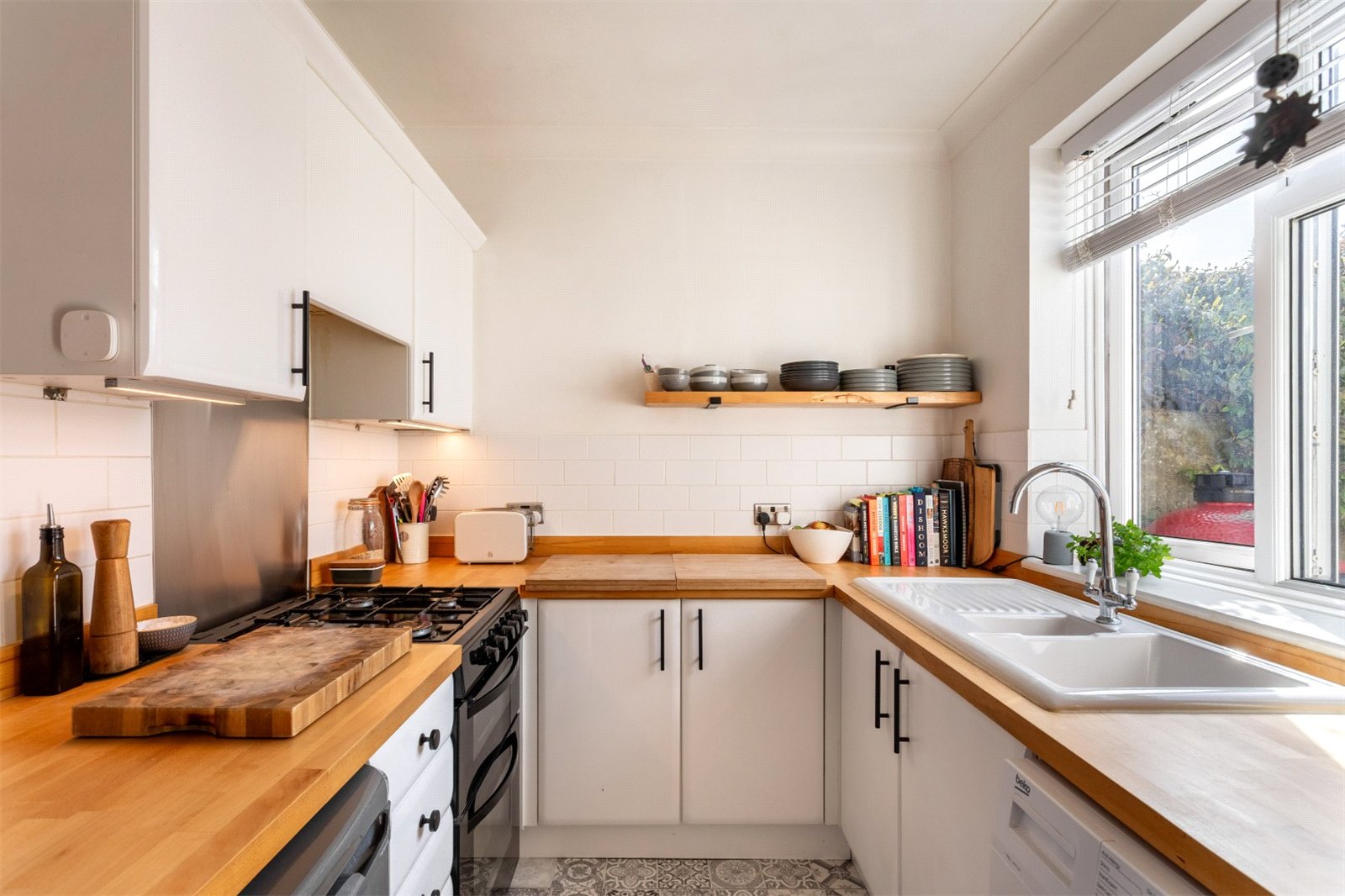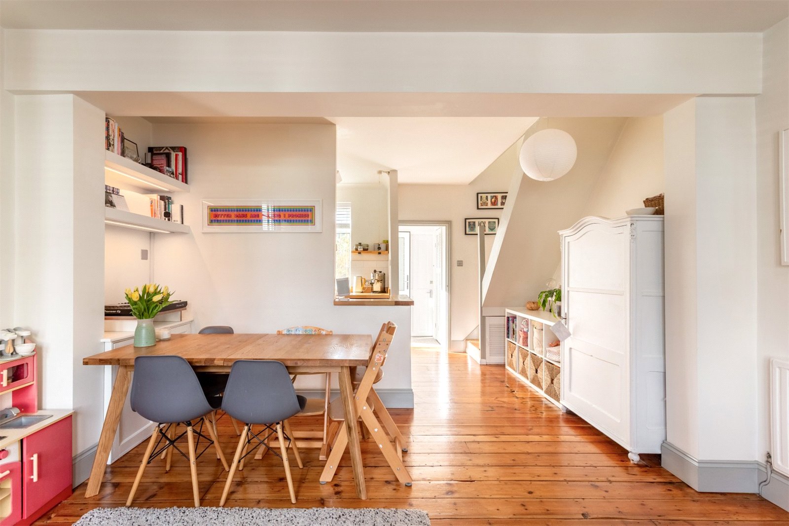 The property is a red brick, Edwardian terrace with bags of curb appeal. Set back slightly from the road, the front garden area give space for secure bike storage and decorative planting. Beyond a small entrance hallway, you enter the spacious open plan lounge dining room. Original stripped wooden flooring and a wood burning stove provide character to the well-presented, bright space. There is useful, built in storage in this room and as with rest of the property the windows are double glazed. The kitchen is separated from the main living space, but still providing that easy connection to the living space. Making it possible to easily keep an eye on little ones or socialise with your dinner guests. A simple contemporary style, with sleek white units, white tiling and black handles complements the wooden work top. The window gives a great view of the garden. There is plenty or work top space for cooking and plumbing for the washing machine.