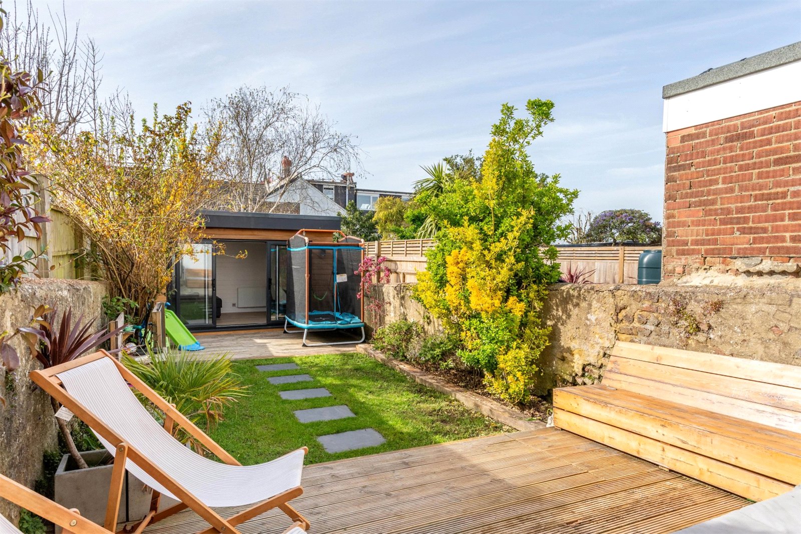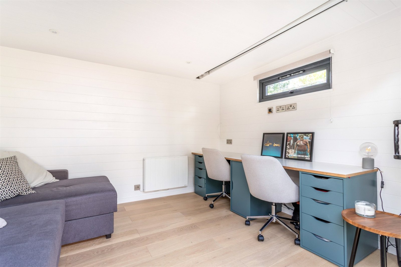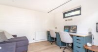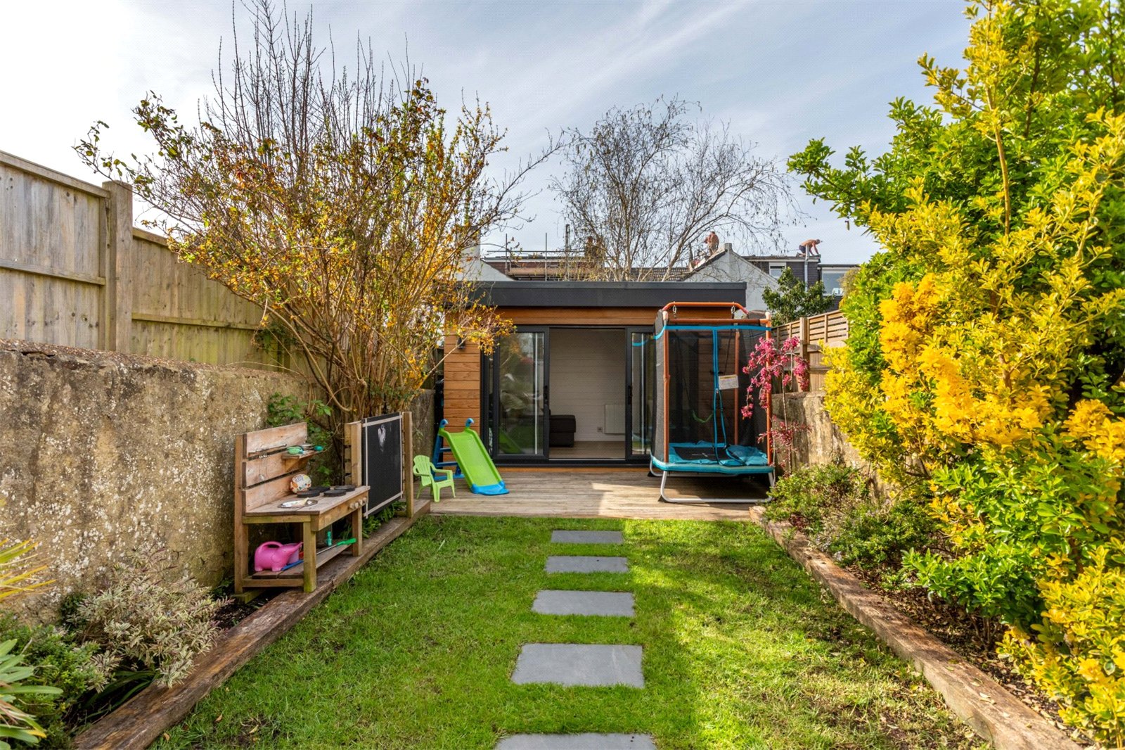 The deck in the well proportioned, south facing garden gets the first sun of the morning, with a seating area set up to sit out and enjoy a morning coffee or two. This looks over the lawned middle section of the garden with planted borders and stepping stones to the recently added home office/garden room. Very smartly fitted out with heating and electrics, the insulated room offers a comfortable work from home space and guest accommodation. The current owners have even added a drop down, home cinema screen for family movie nights.