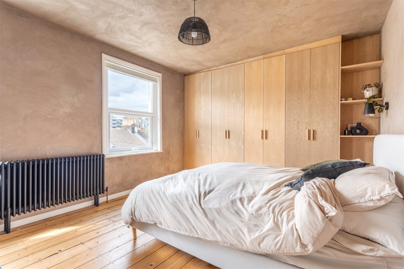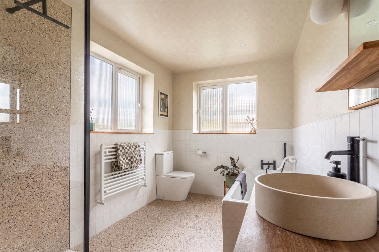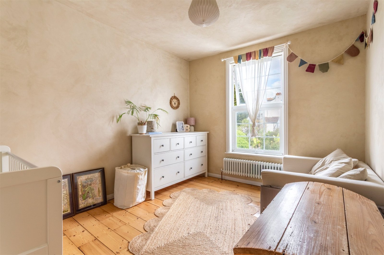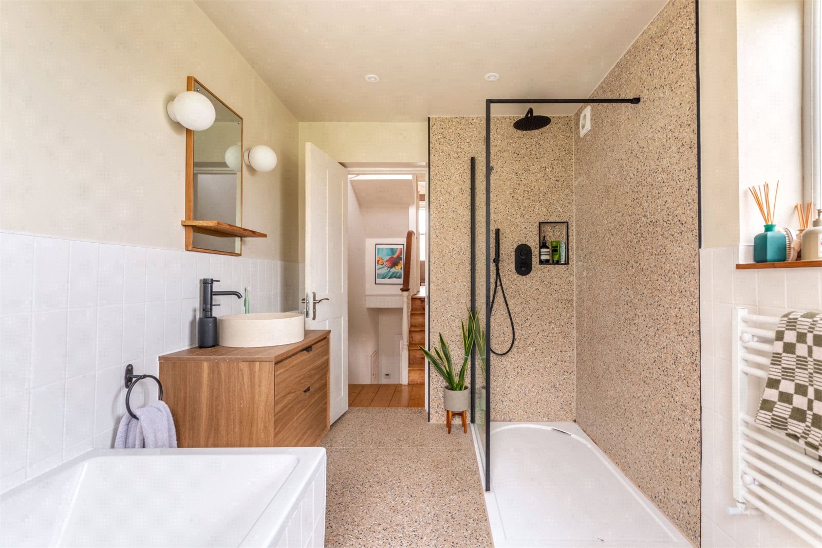 On the first floor are two double bedrooms, the largest of which has a range of double wardrobes and built in shelving and a cast-iron ‘school style’ radiator. It further benefits from stripped wooden floorboards. The second bedroom has large window overlooking the garden and again benefits from wooden floorboards. Also on this floor is a spacious modern dual aspect bathroom, with half tiled walls, ladder style radiator, tiled enclosed bath, low level close coupled WC and a stylish round wash hand basin inset in vanity unit. Separate walk-in shower with glazed screen and rainfall shower head.