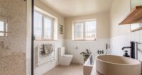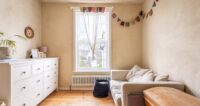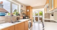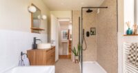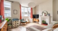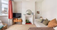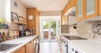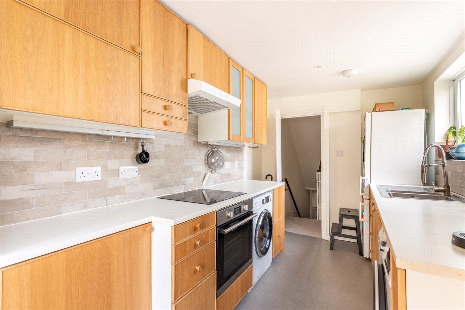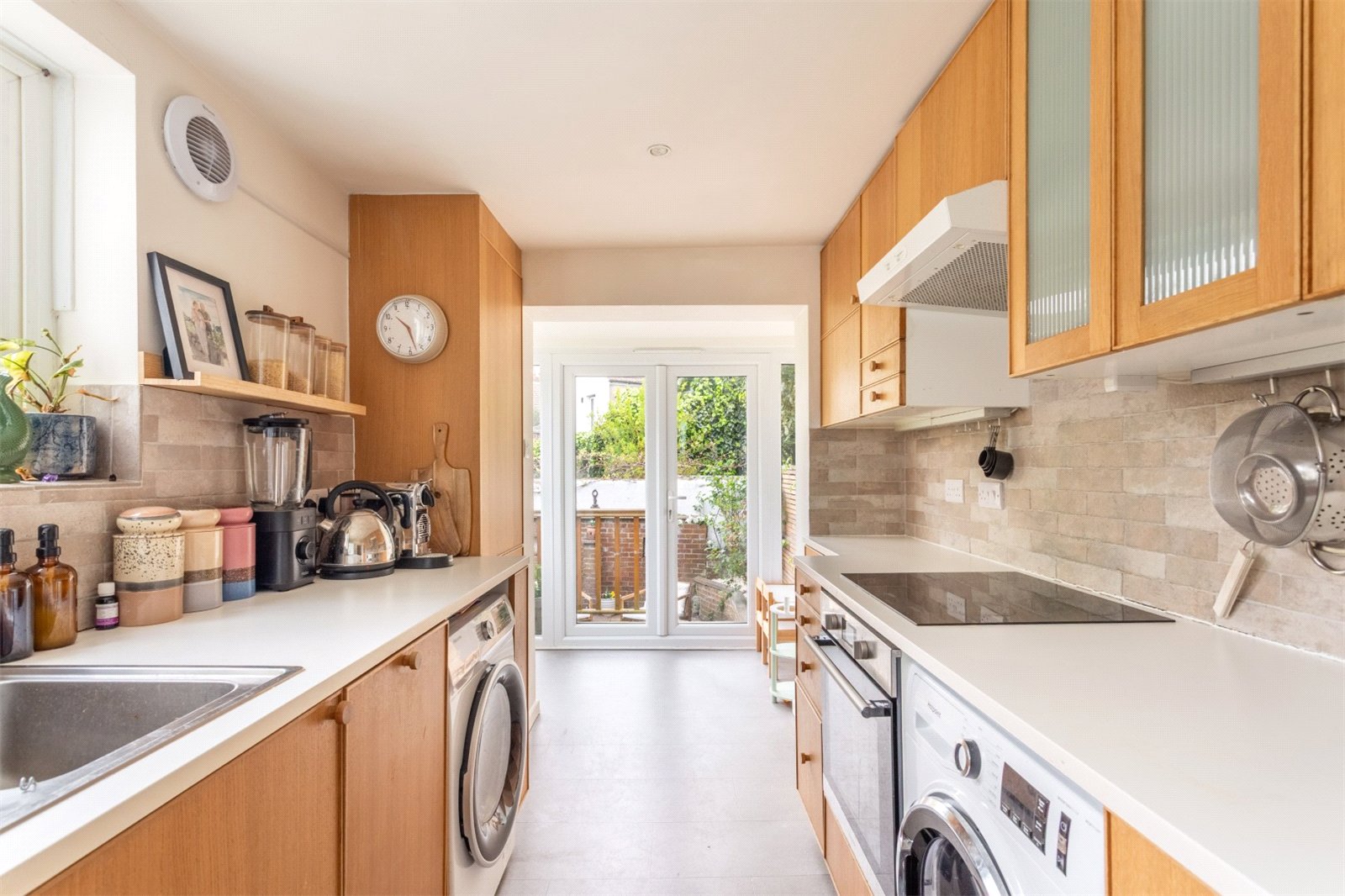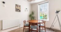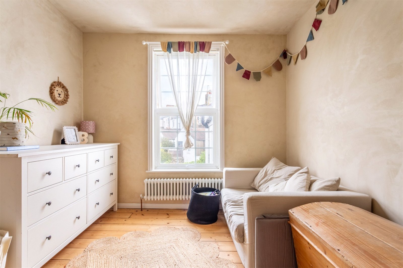 On the first floor are two double bedrooms, the largest of which has a range of double wardrobes and built in shelving and a cast-iron ‘school style’ radiator. It further benefits from stripped wooden floorboards. The second bedroom has large window overlooking the garden and again benefits from wooden floorboards. Also on this floor is a spacious modern dual aspect bathroom, with half tiled walls, ladder style radiator, tiled enclosed bath, low level close coupled WC and a stylish round wash hand basin inset in vanity unit. Separate walk-in shower with glazed screen and rainfall shower head.