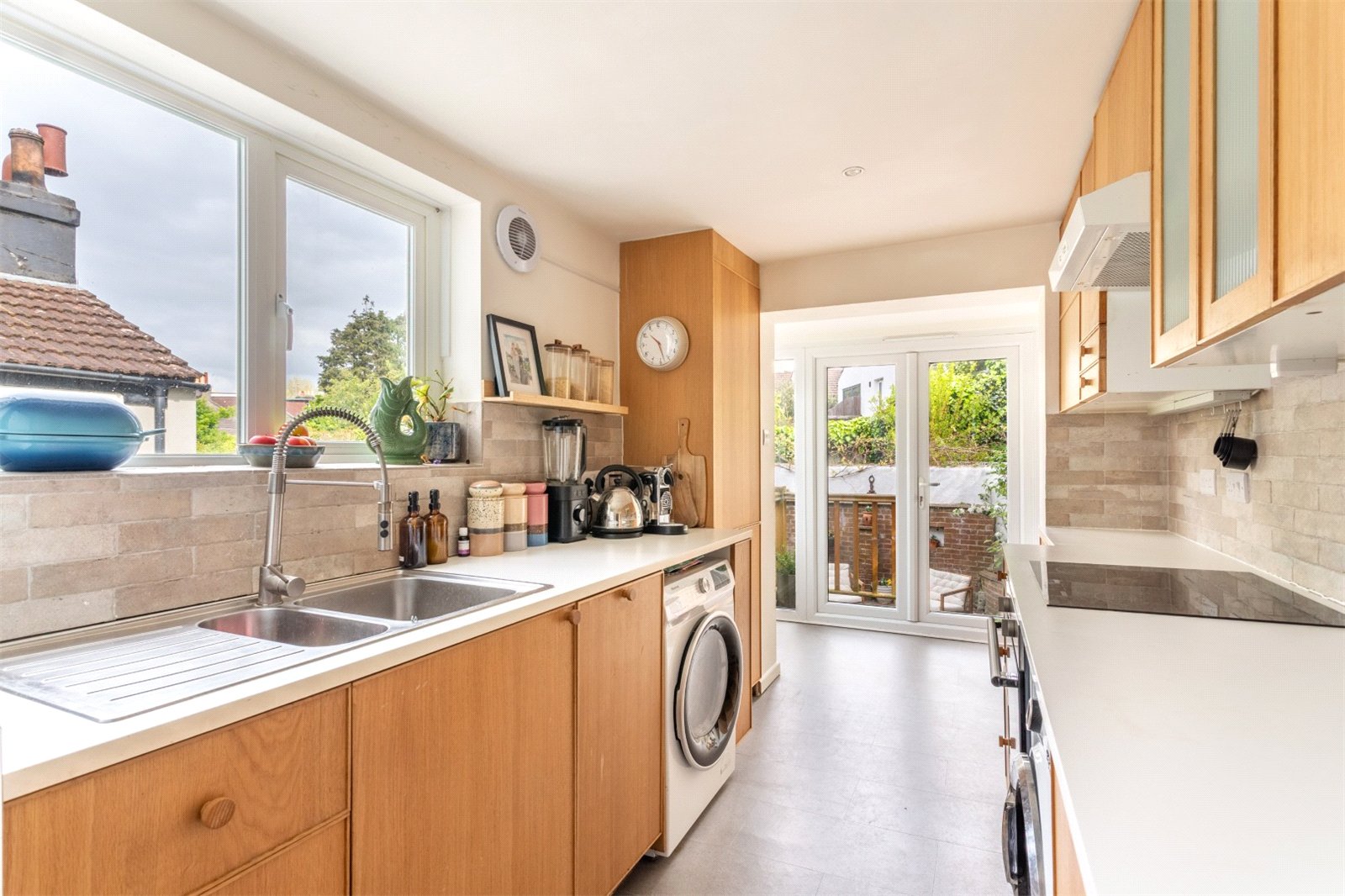 On the first floor there is a good size lounge with one bay window and a further window letting in plenty of light. The room is packed with period features including coved ceiling and central ceiling rose, and has parquet style flooring. There is a separate dining room with a large window overlooking the garden – this room could also be used as fourth bedroom. The kitchen features an extensive range of mid-century style wall & base units with ample space for a full range of appliances – there is an archway through to a sun room (which could be used as a breakfast area) with French doors leading to the rear garden.