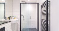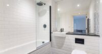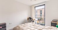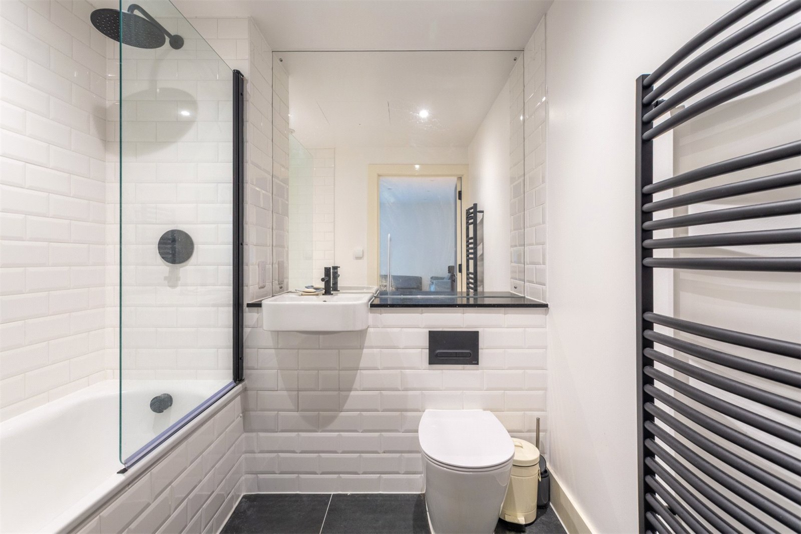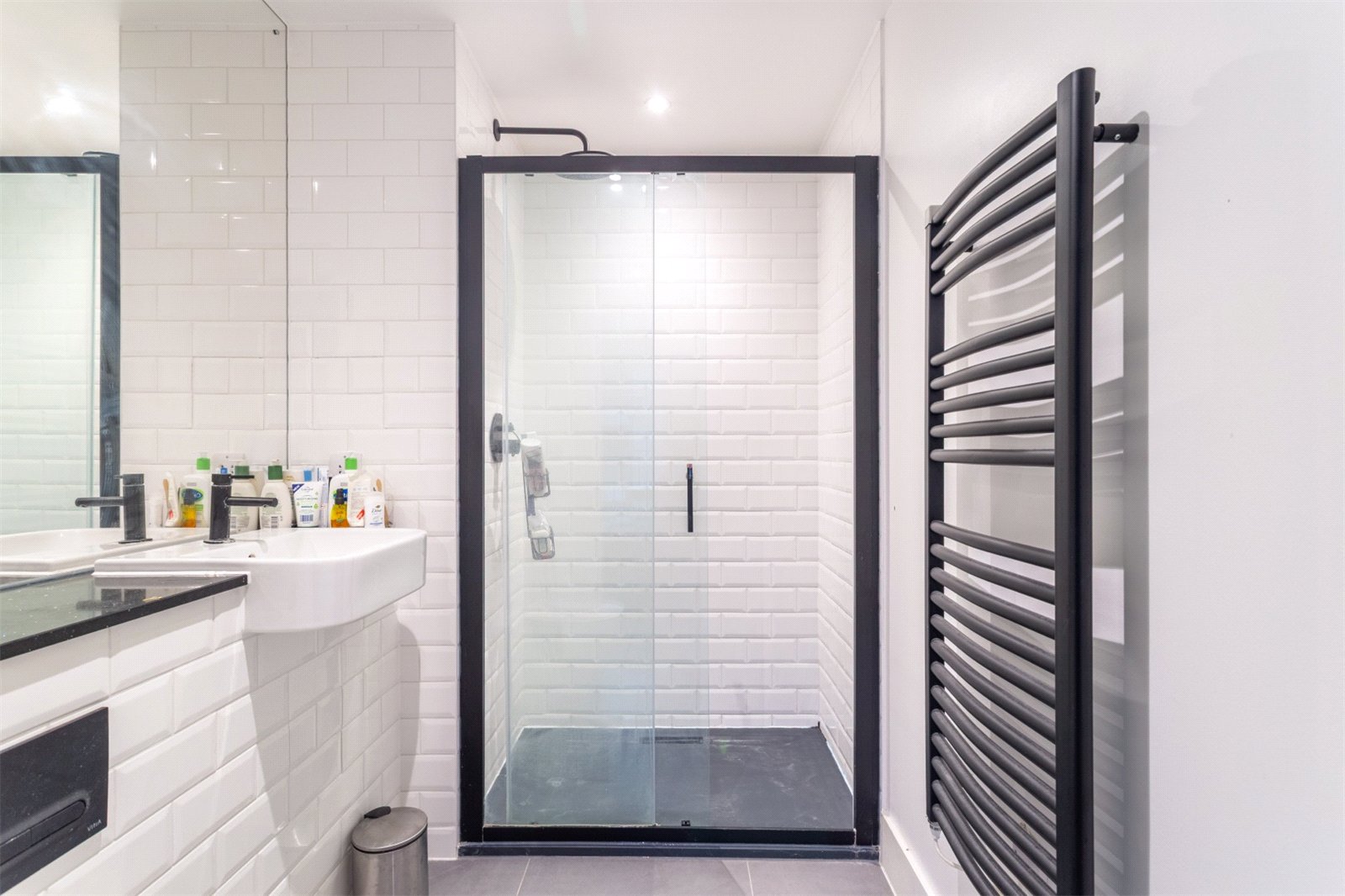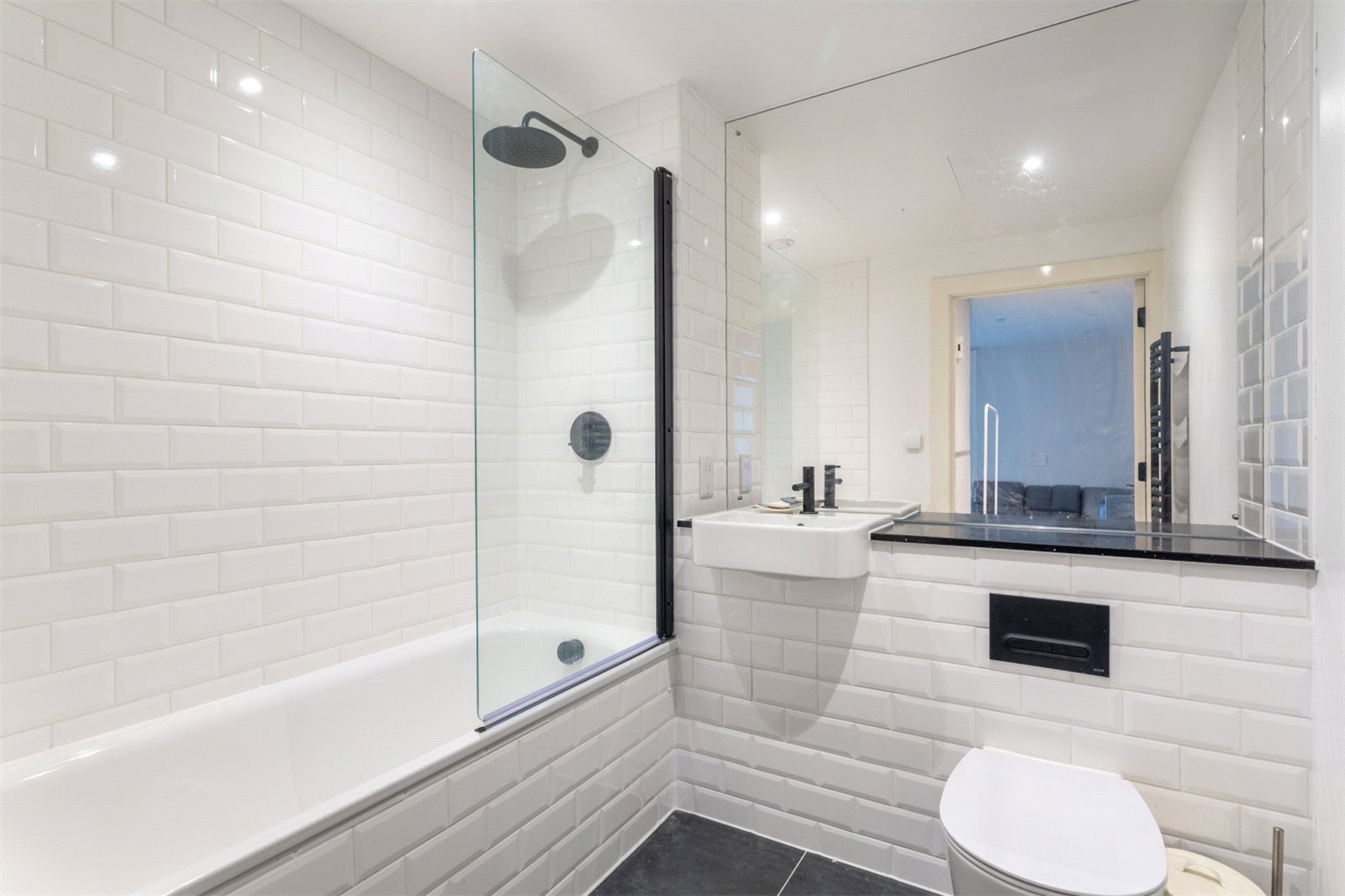 The two bedrooms are both good-sized doubles with one having an ensuite with a shower, WC and basin along with a large mirror, tiled with sleek white tiles and offset with black trim and bath ware. The second bathroom mirrors the ensuite with the same stylish finish. The property also benefits from underfloor heating