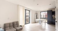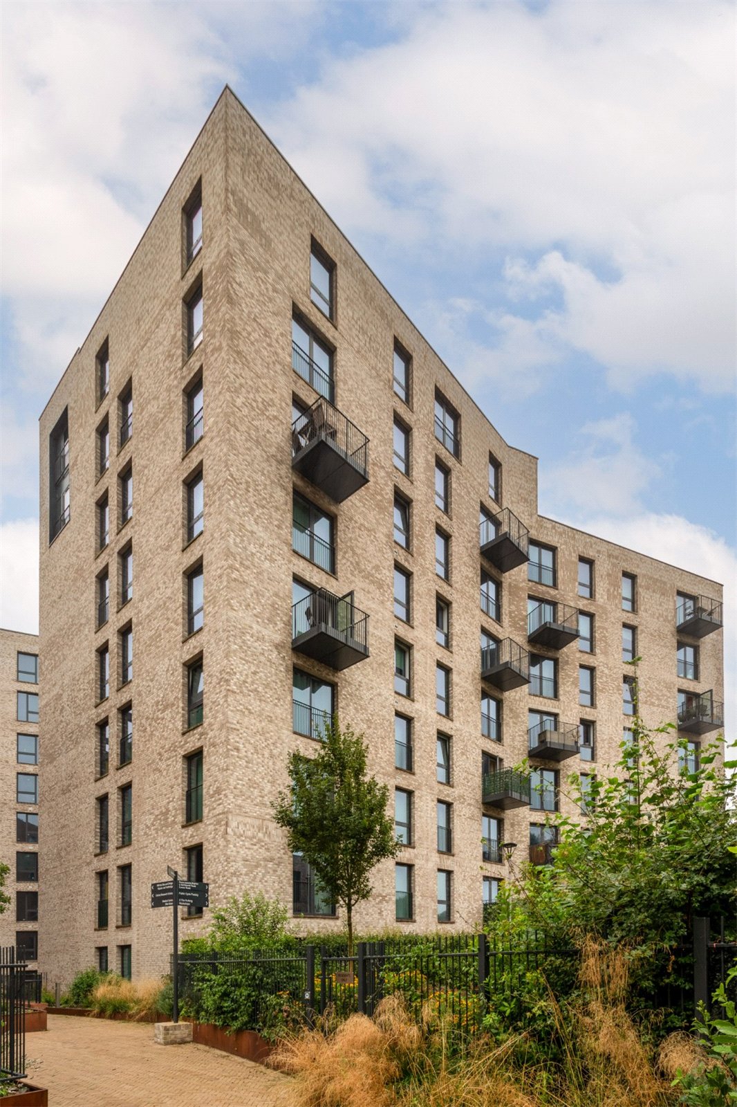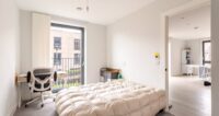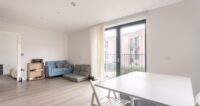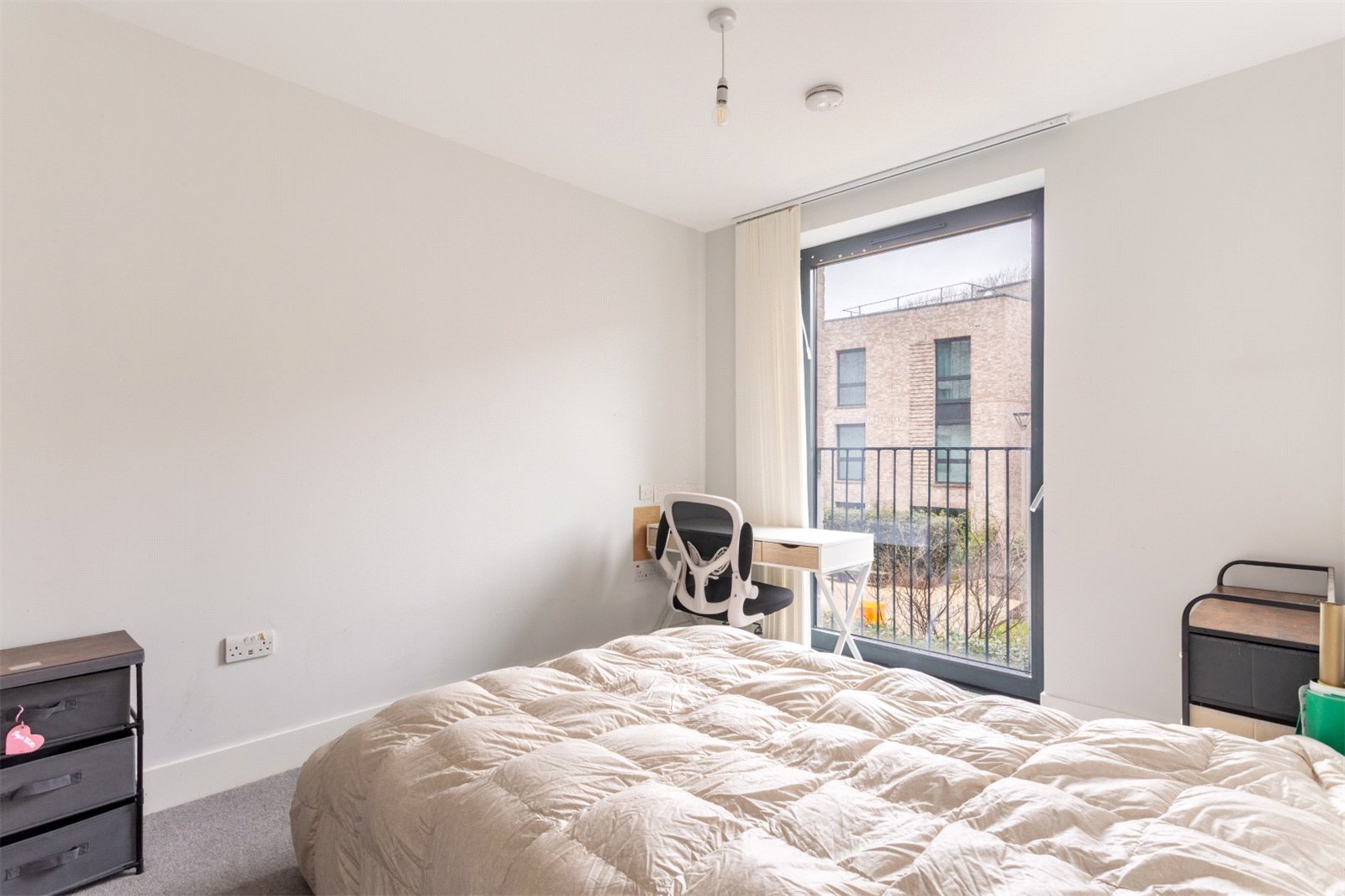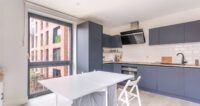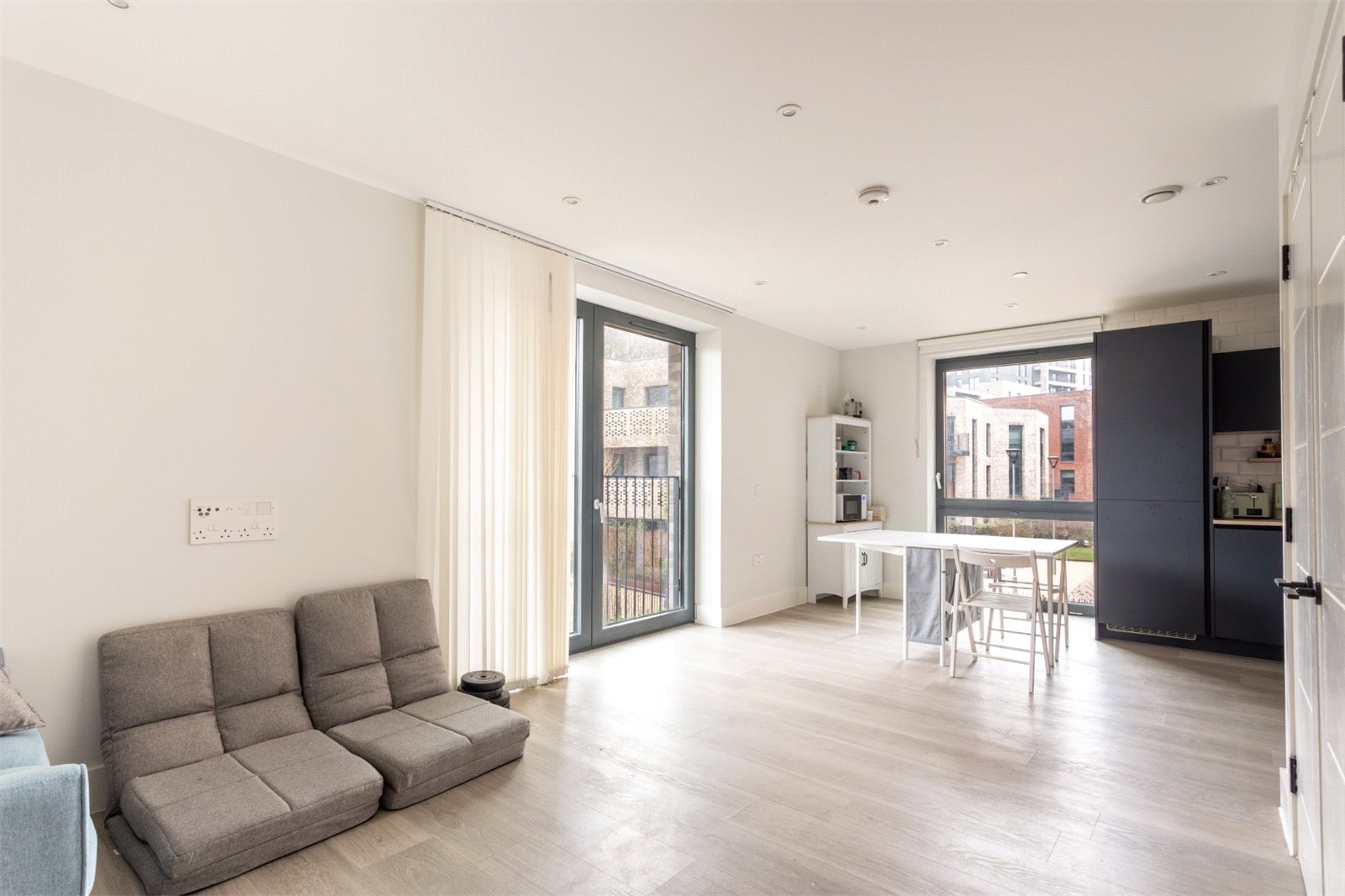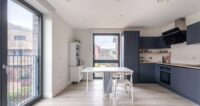 Upon entering the communal entrance, you have both lift and stair options up to the apartment which are securely accessed by a fob system. This large contemporary two-bedroom flat is located on the second floor of this new build property. The spacious entrance hallway of the apartment leads to the sizeable open plan kitchen, dining and lounge area which are finished to an exceptionally high standard with a stylish feel. Fitted matte blue kitchen units are offset by a sharp white metro tiling. This is an impressively sized, bright space which can comfortably accommodate a large sofa and dining table and is the perfect space for relaxation or entertaining guests. A sweet Juliet balcony offers views out to the manicured communal gardens.