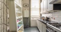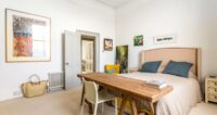 The second bedroom is located across the communal hallway. Once again it is a well-finished double with painted floorboards and a period fireplace. An en-suite wc with a washbasin makes this an ideal guest room or, for those who work from home, an excellent office space away from the rest of the flat.