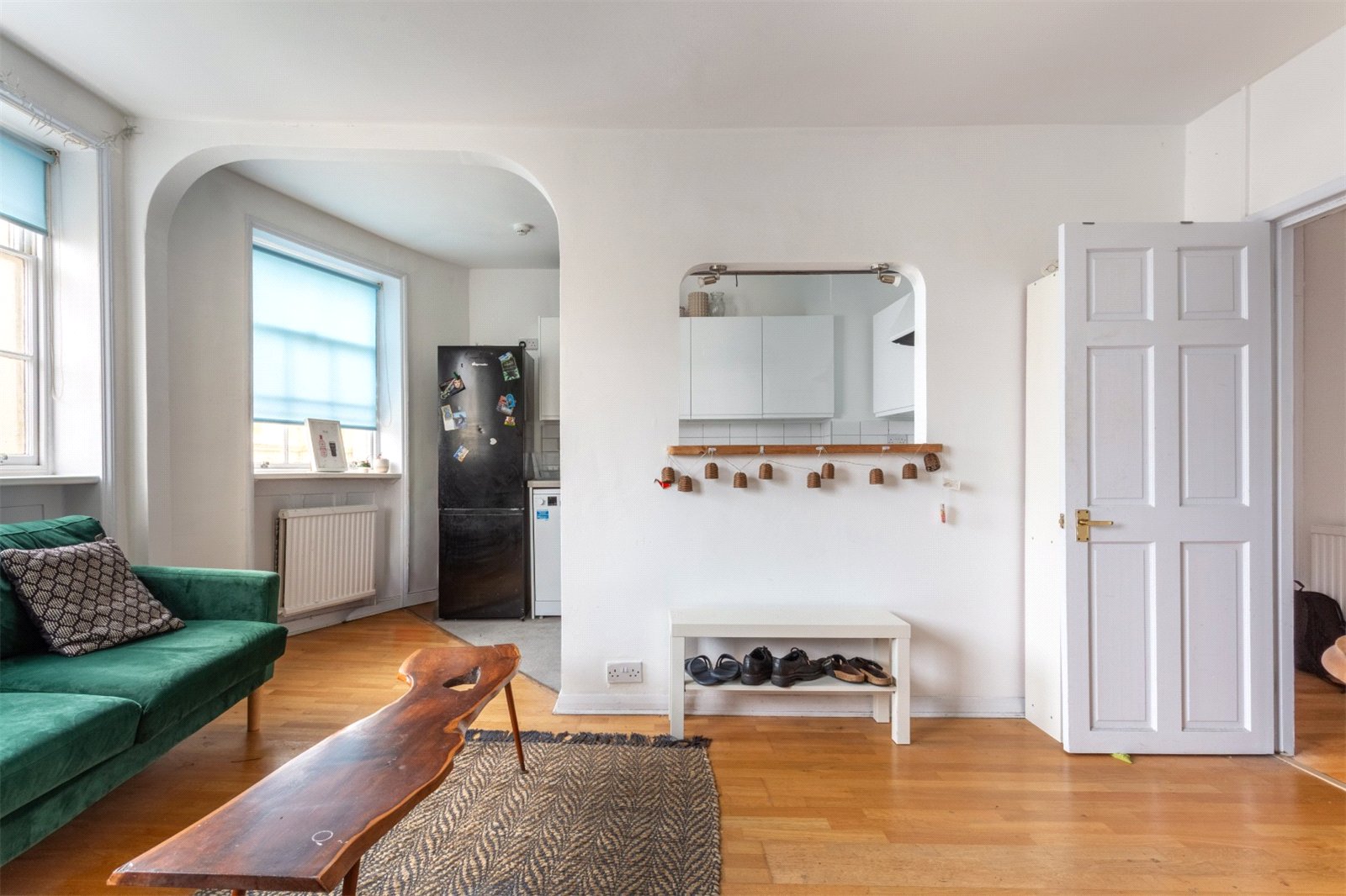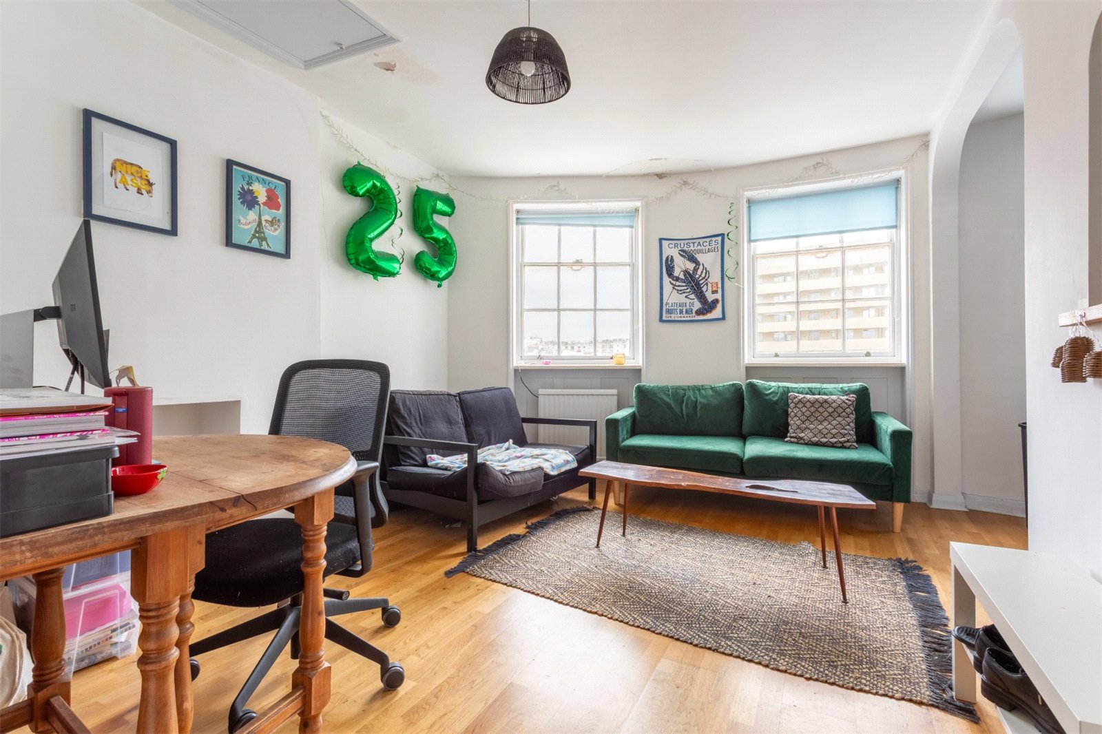 The property is a well-presented top-floor flat within an attractive Georgian building on the highly desirable Hove seafront. A spacious hallway provides access to all rooms in the accommodation, which comprises a large open-plan kitchen/living room equipped with white goods and offering plenty of space for a sofa and dining table; two sizeable double bedrooms, both benefiting from builtin storage; and a bathroom with a shower attachment over the bath.