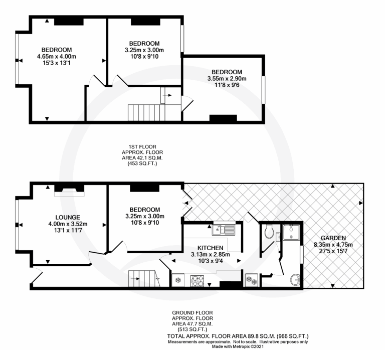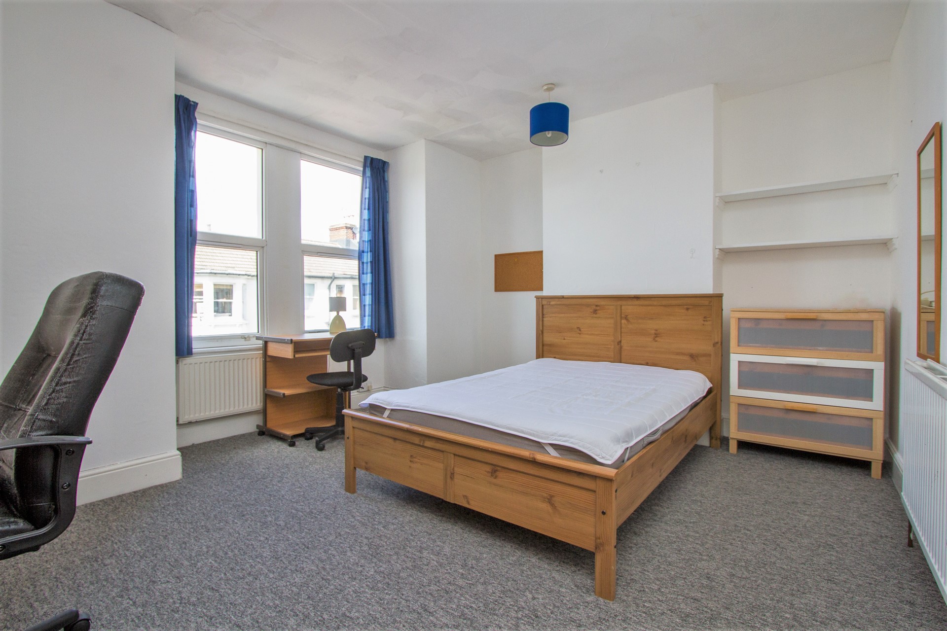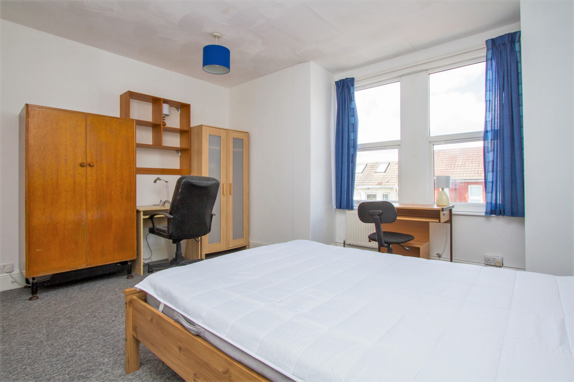 There is one double bedroom on the ground floor which also has access out into the garden. Also located on the ground floor is a shower and separate toilet. On the first floor there are four more bedrooms, all fully furnished with a bed, desk, wardrobe and chest of draws. Two of the bedrooms are good sized singles.