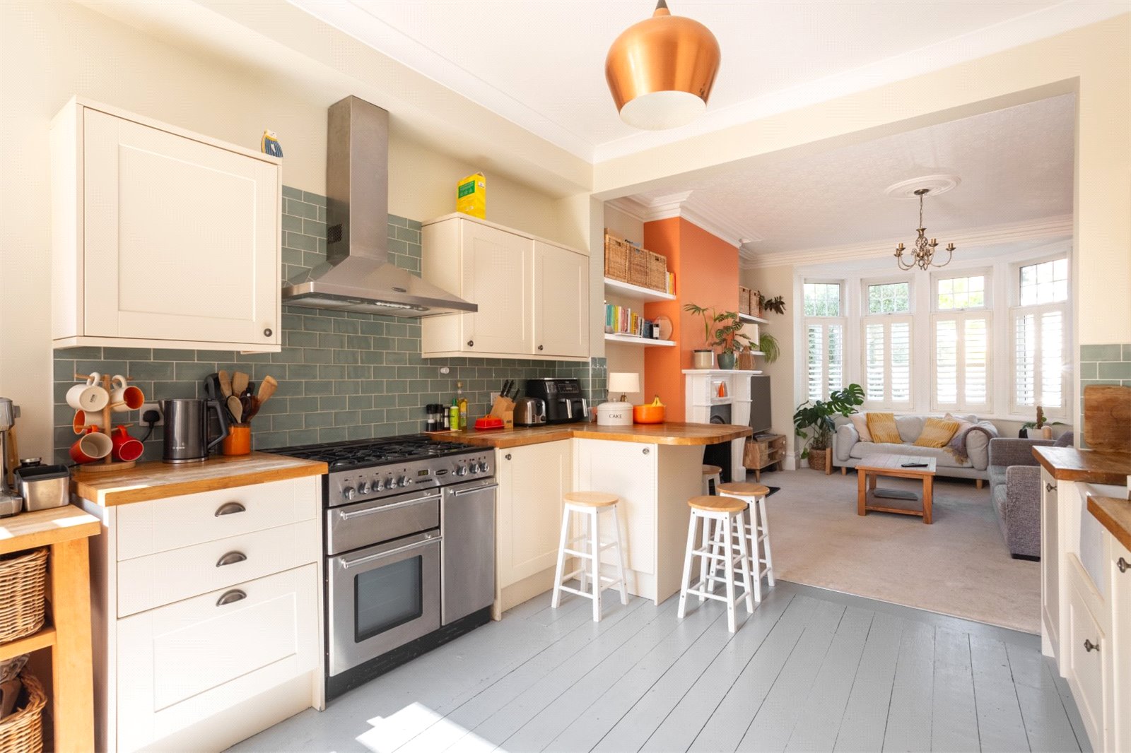 The front door opens into a hallway with wooden flooring, where there is a useful storage cupboard beneath the stairs. The main open-plan living space is on the right off the hall. This generously proportioned room includes a bright, modern kitchen with grey-painted floorboards and a breakfast bar that seats four. The cream shaker-style units are paired with solid wood worktops, tiled splashbacks, and a ceramic butler sink. Appliances include an integrated dishwasher and full-height fridge-freezer, with space provided for a range cooker.